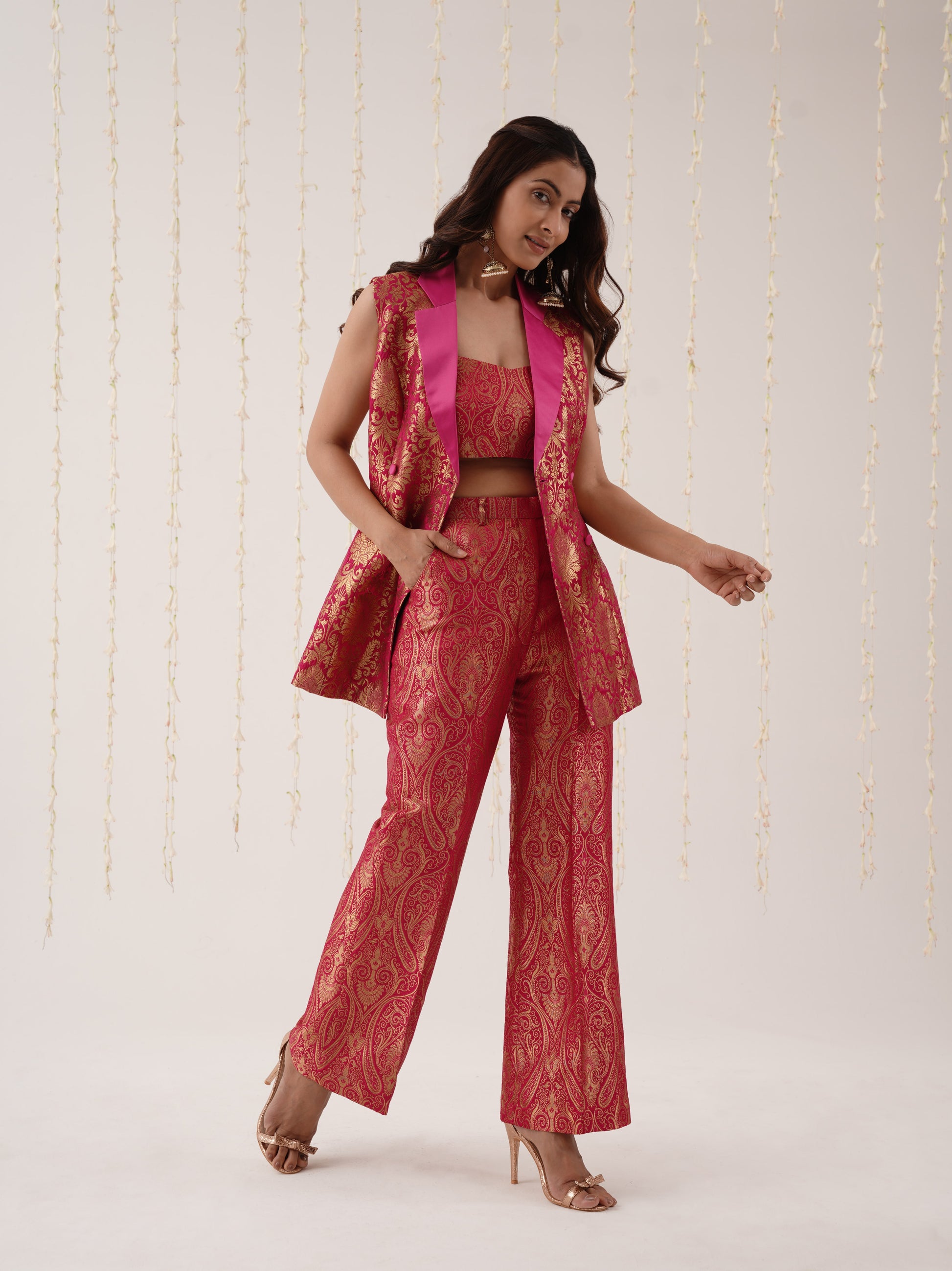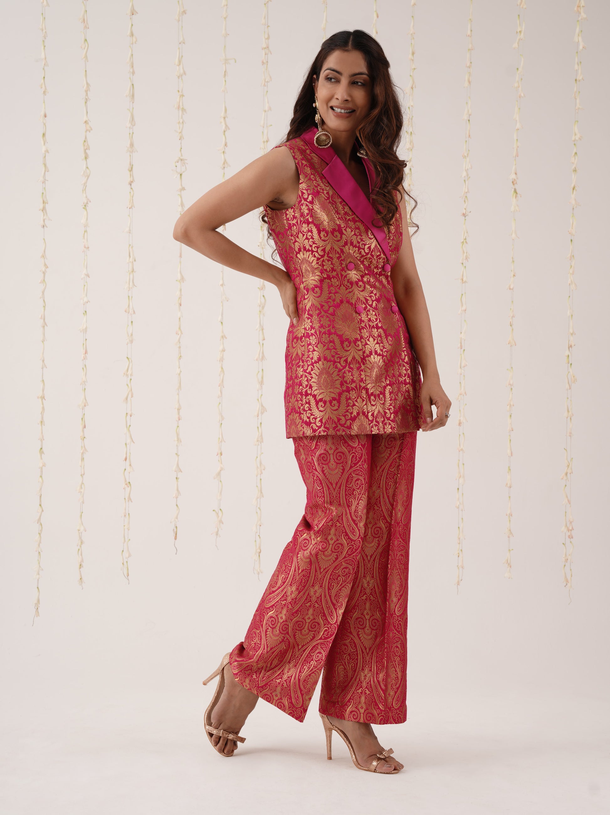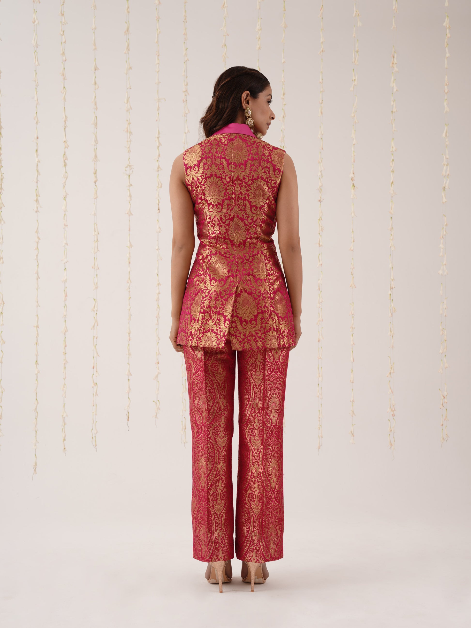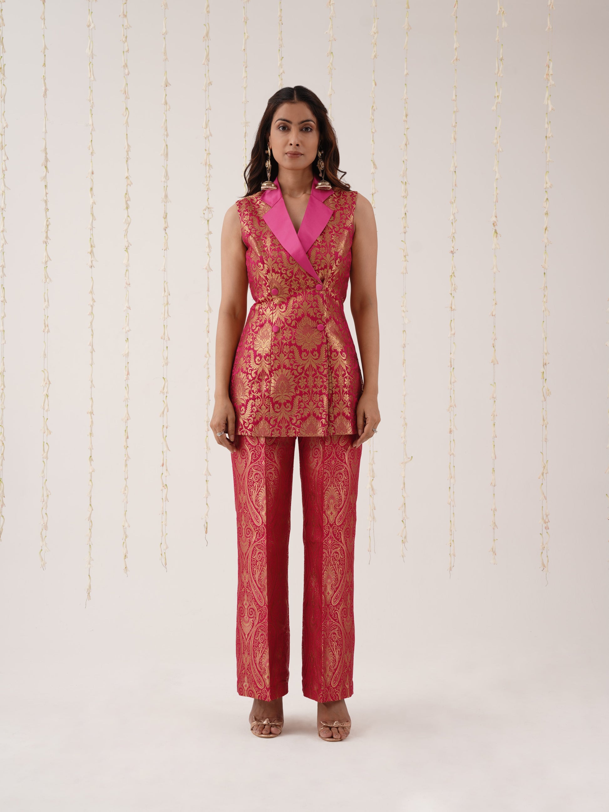 A sleeveless double-breasted blazer with a contrasting hot pink lapel — structured, striking, and sharp.