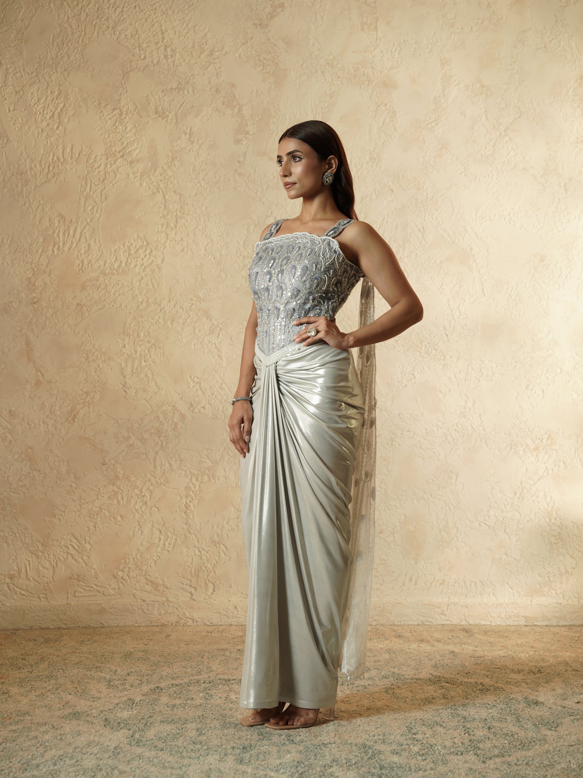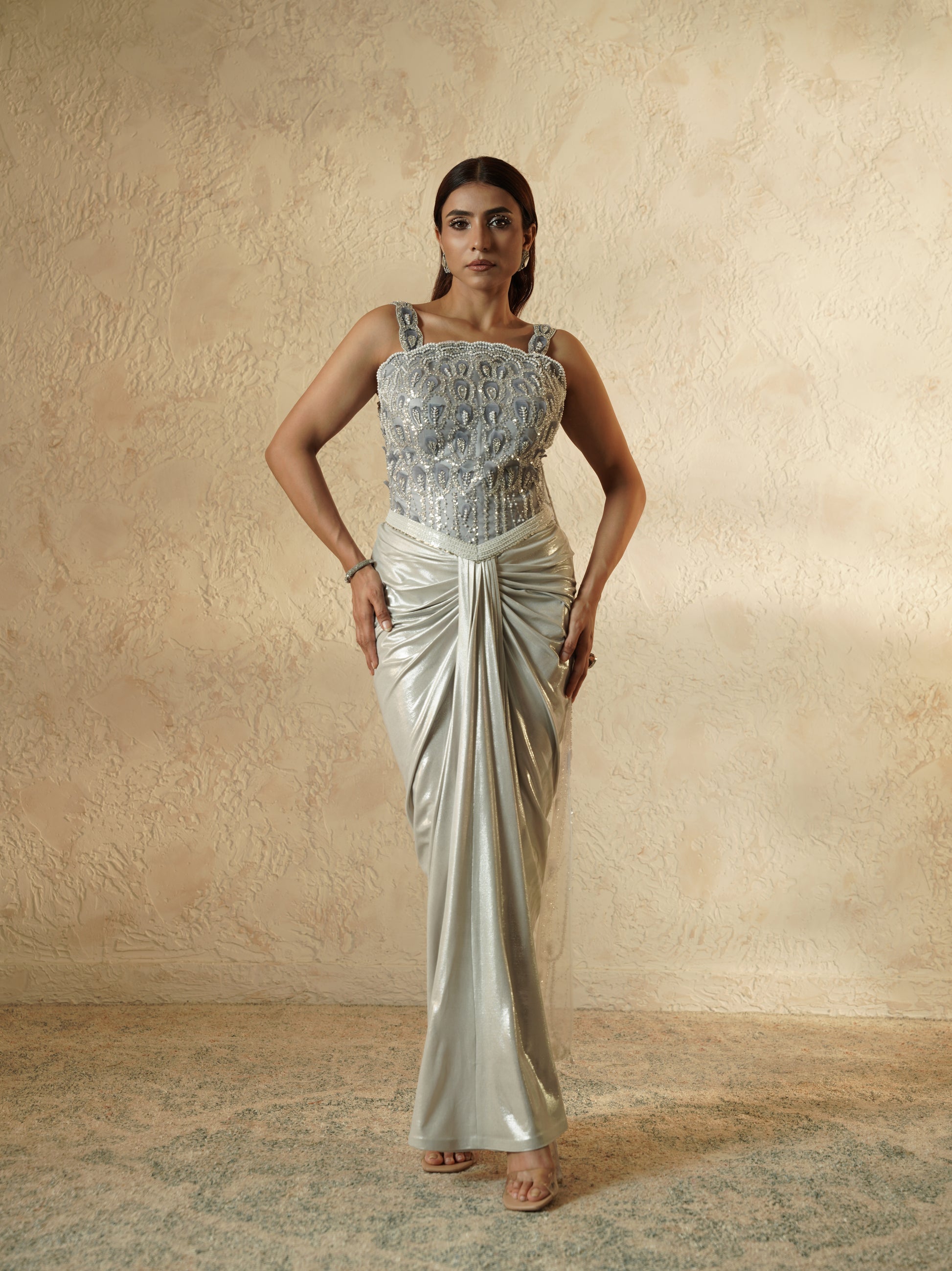 Corset with drape, saree draped skirt, Step into modern elegance with Pulse at Pink’s CELIA Set, featuring a stylish corset with drape and a saree draped skirt. Perfect for weddings, parties, and festive occasions, this designer fusion outfit combines traditional charm with contemporary fashion. Explore women’s designer wear, modern saree set, party wear corset saree, draped skirt outfit, and Indian fusion dress at Pulse at Pink.