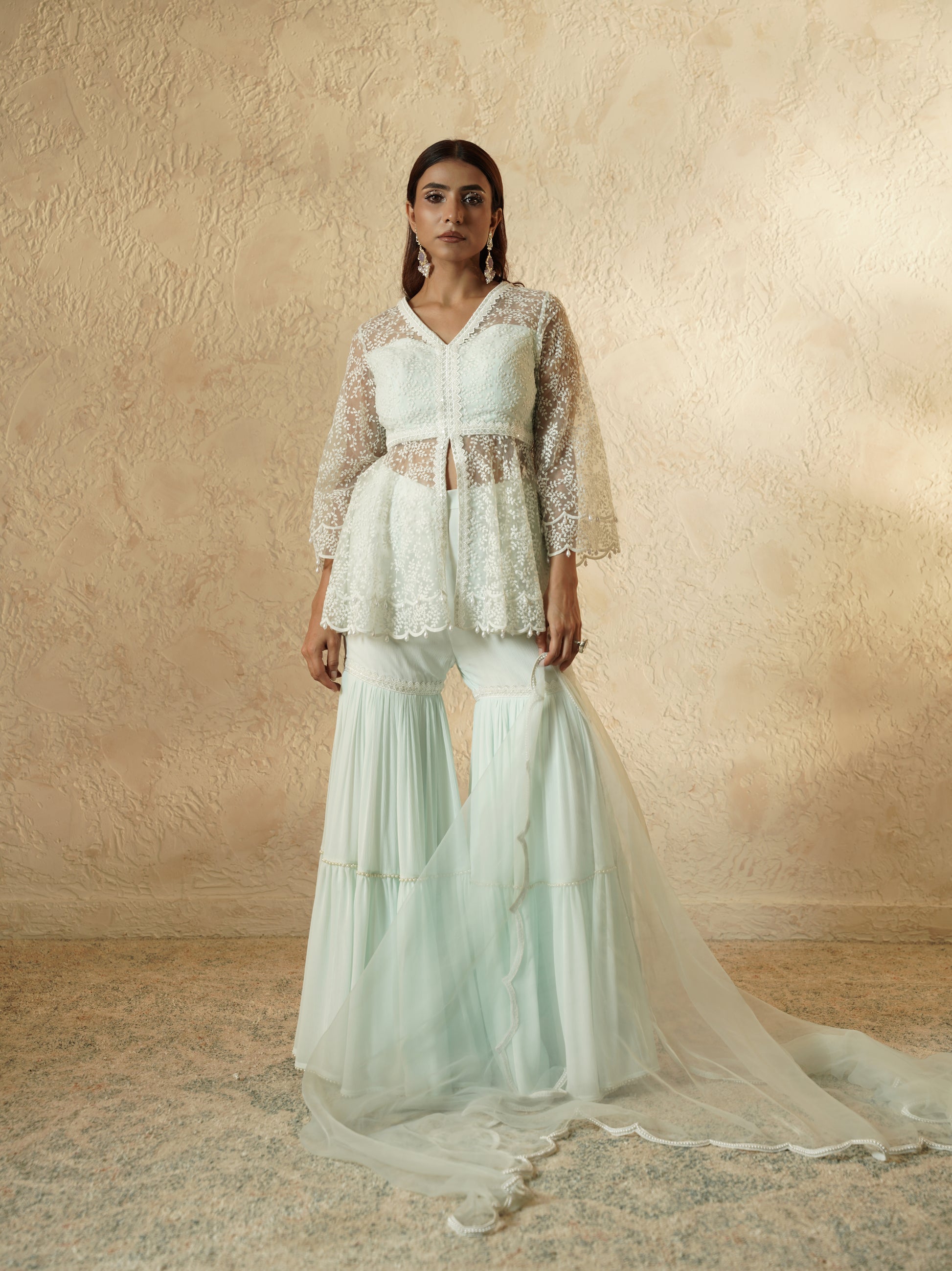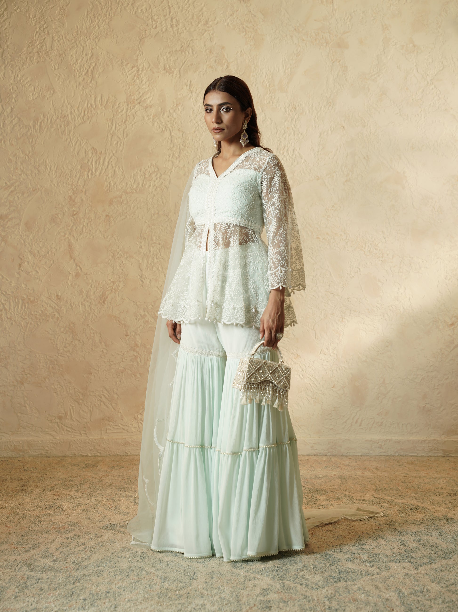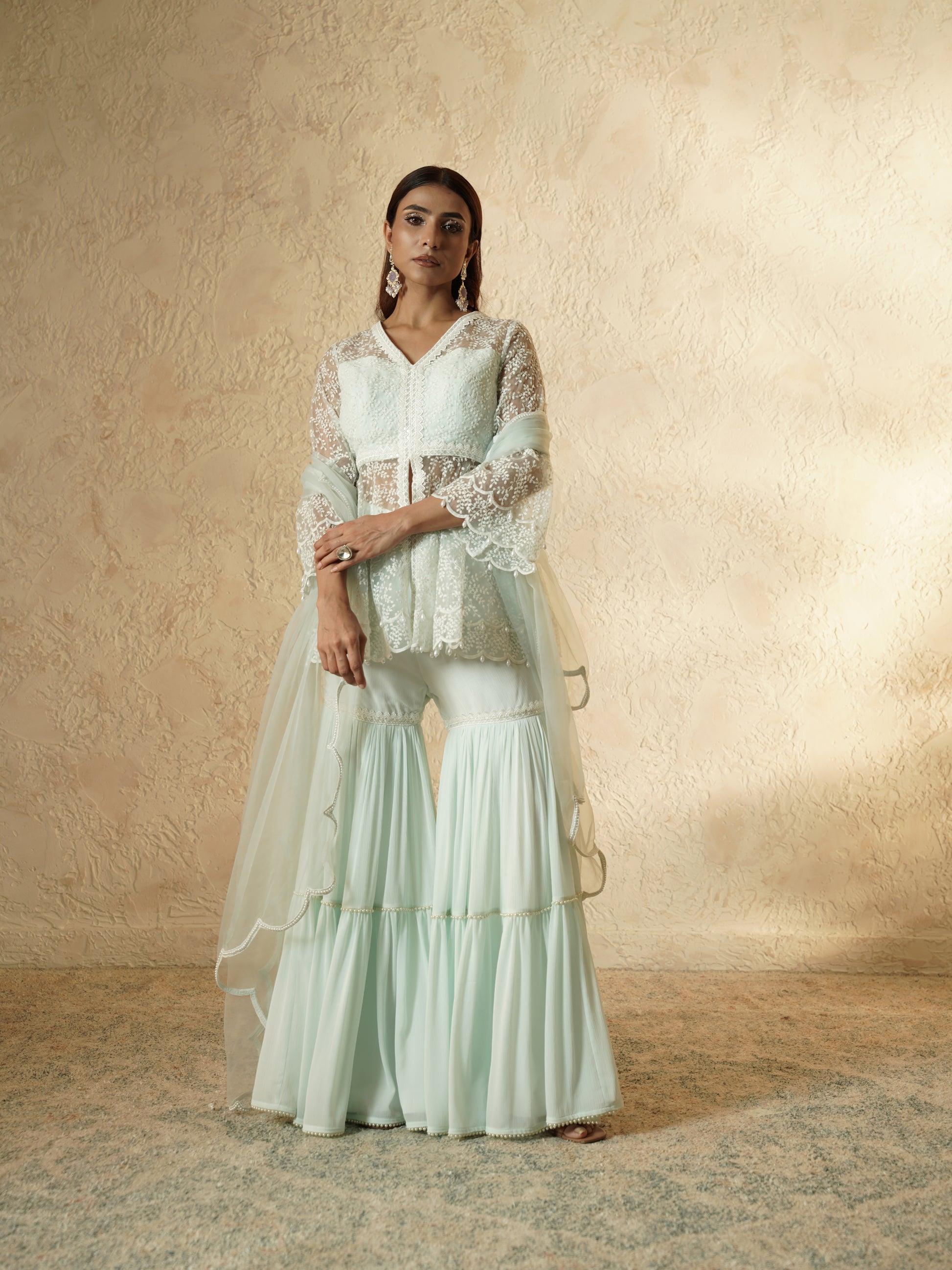 Embrace royal elegance with Pulse at Pink’s CYNARA Set, featuring a front-open fit and flare peplum kurta, tiered gharara, and dupatta. Perfect for weddings and festive occasions, this designer gharara set blends traditional craftsmanship with modern sophistication. Shop women’s ethnic wear, party wear gharara suit, Indian festive outfit, peplum kurta set, and designer dupatta set only at Pulse at Pink.