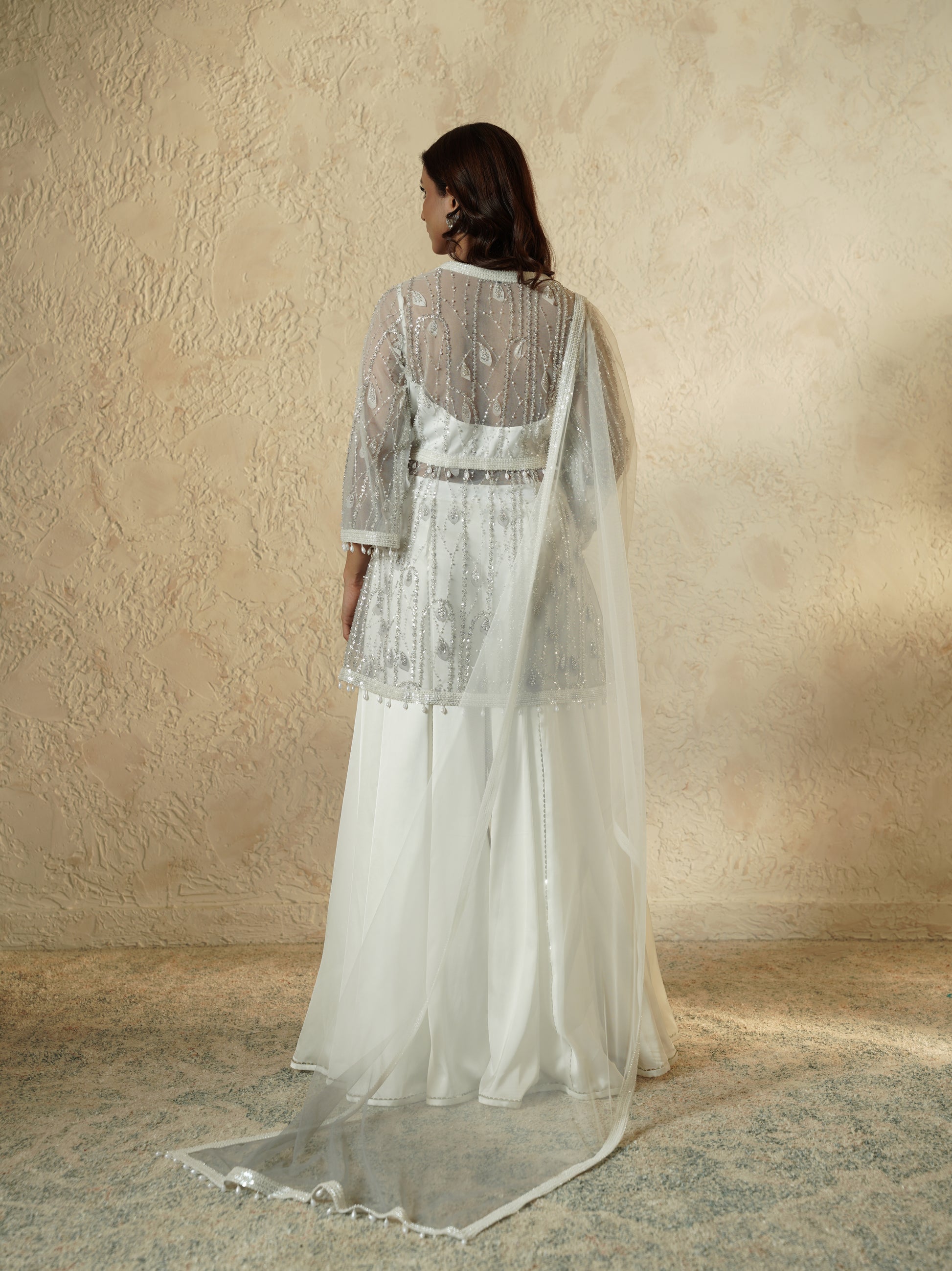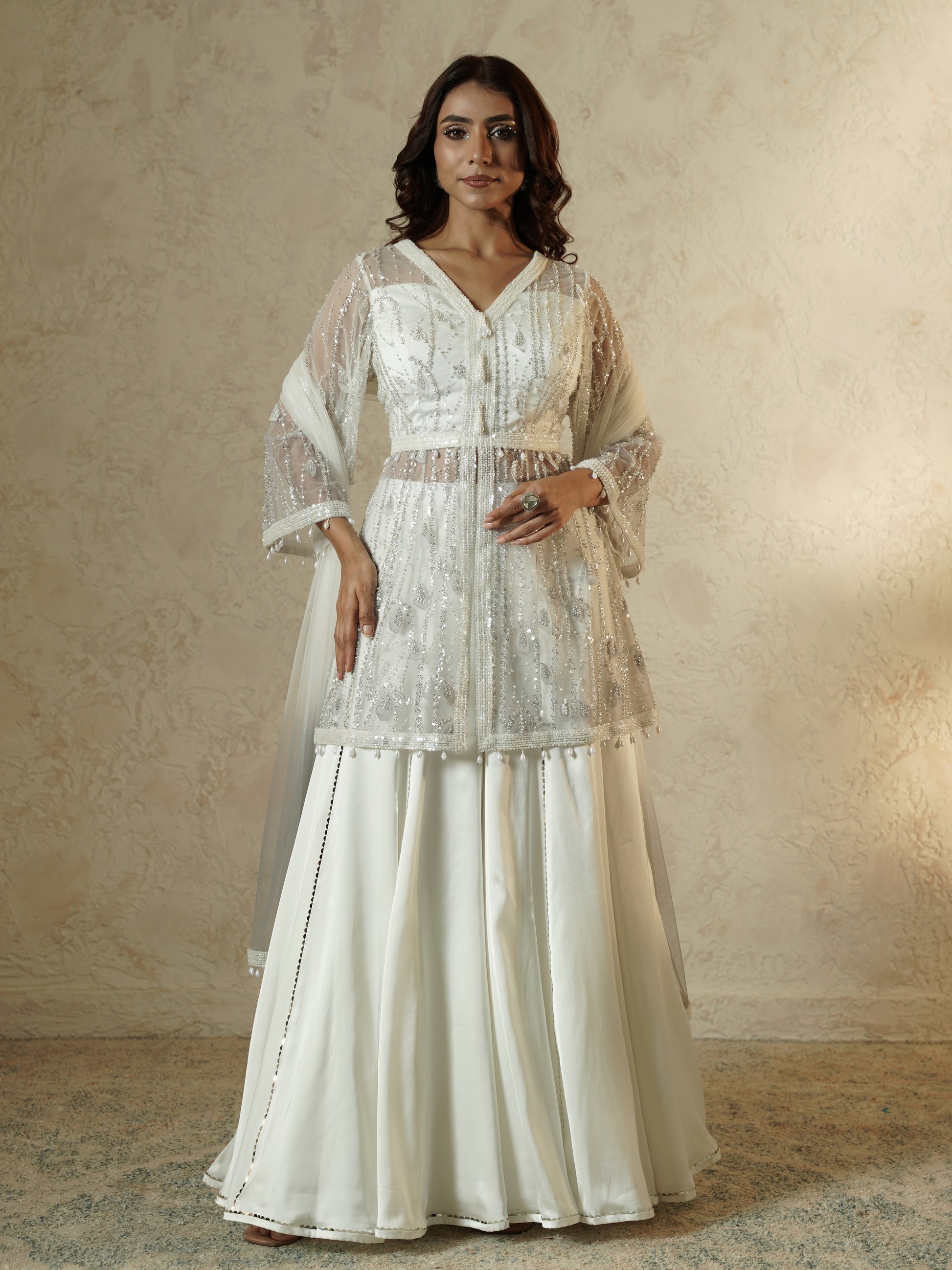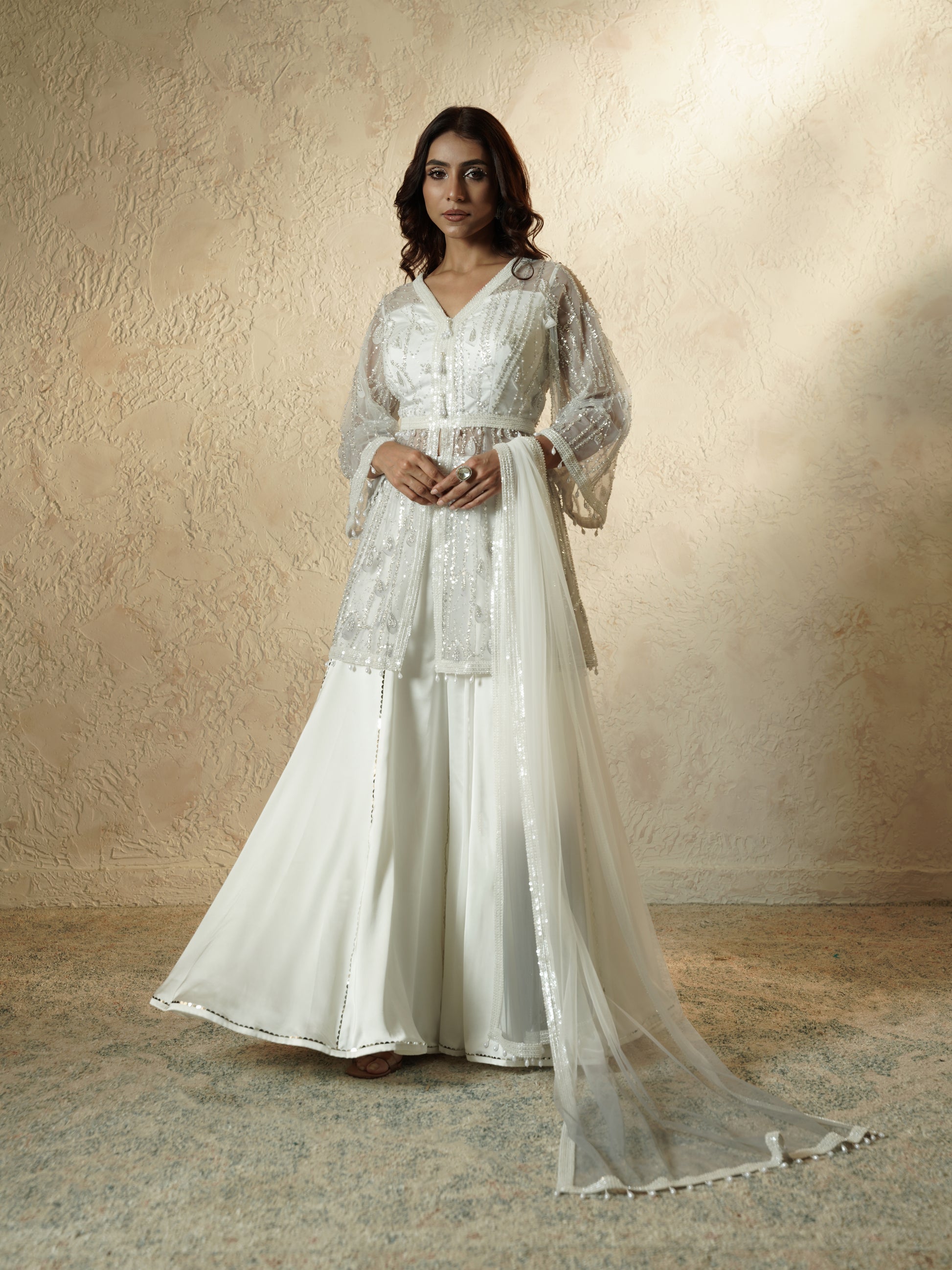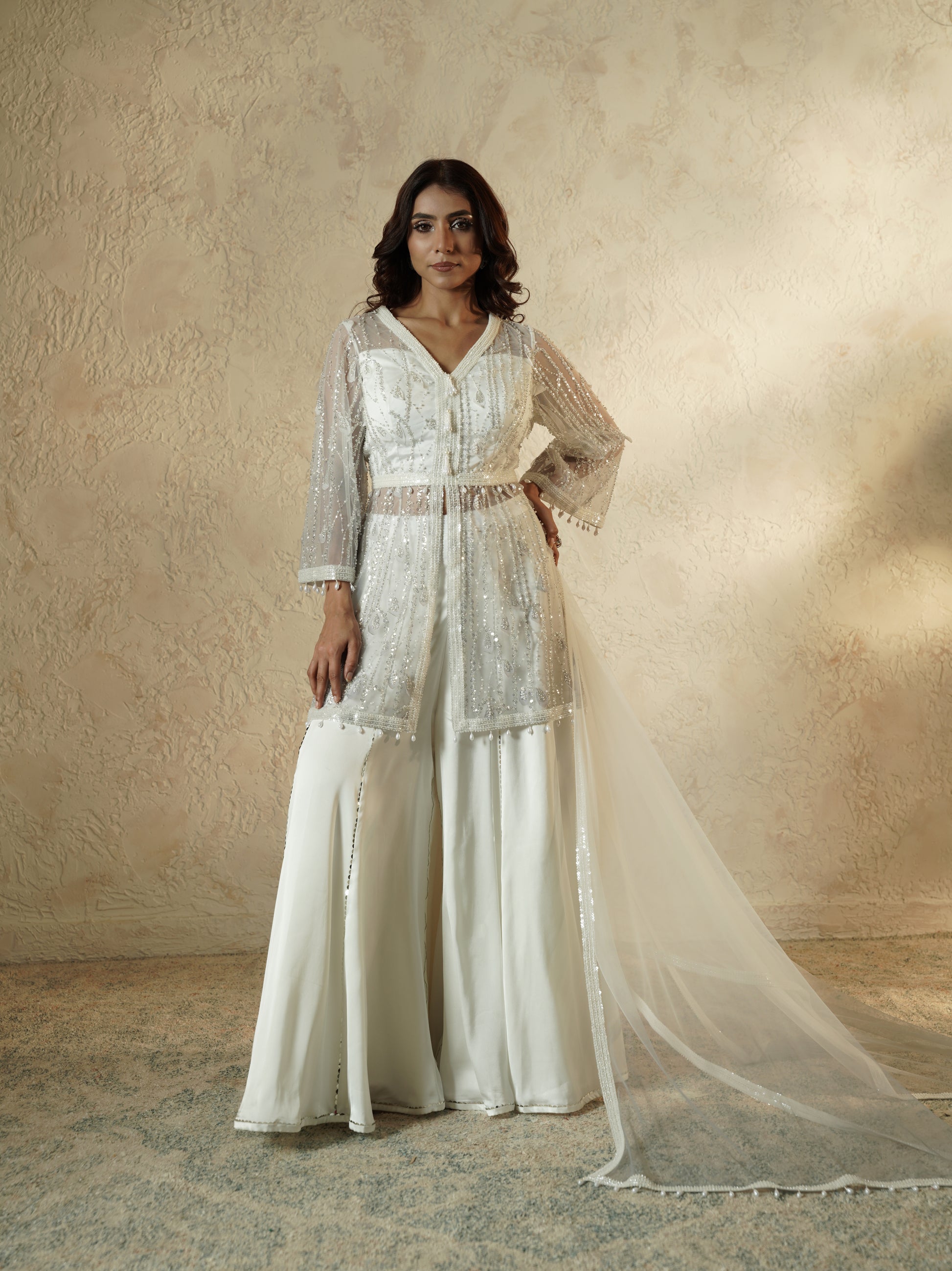 Front open fit and flare jacket and flared sharara and dupatta, Discover elegance with Pulse at Pink’s front-open fit and flare jacket paired with a flared sharara and dupatta. This designer sharara set blends ethnic elegance and modern style, perfect for weddings, parties, and festive occasions. Shop the latest women’s ethnic wear, Indian festive outfit, party wear sharara suit, bridal sharara set, and stylish jacket sharara design online at Pulse at Pink