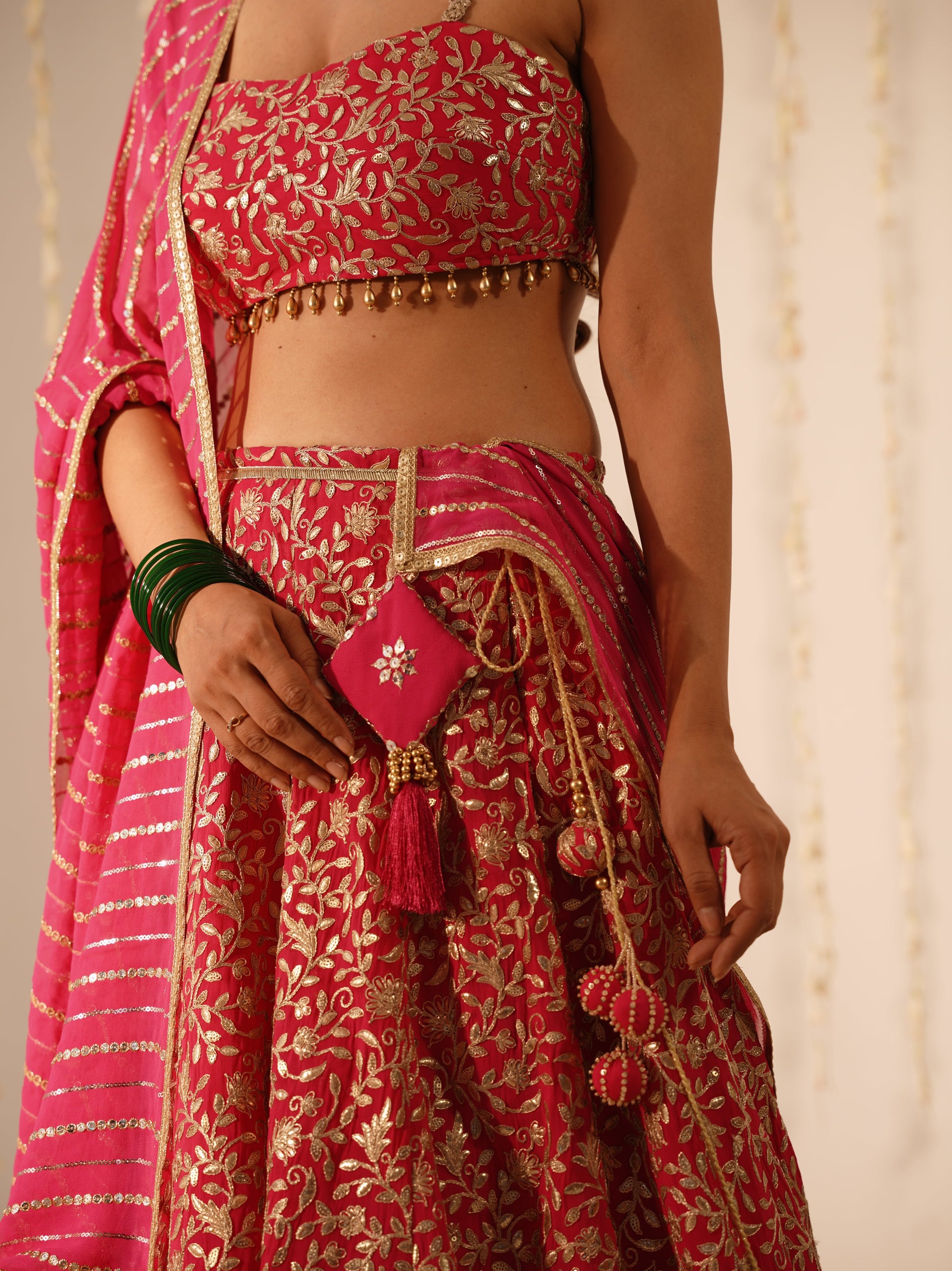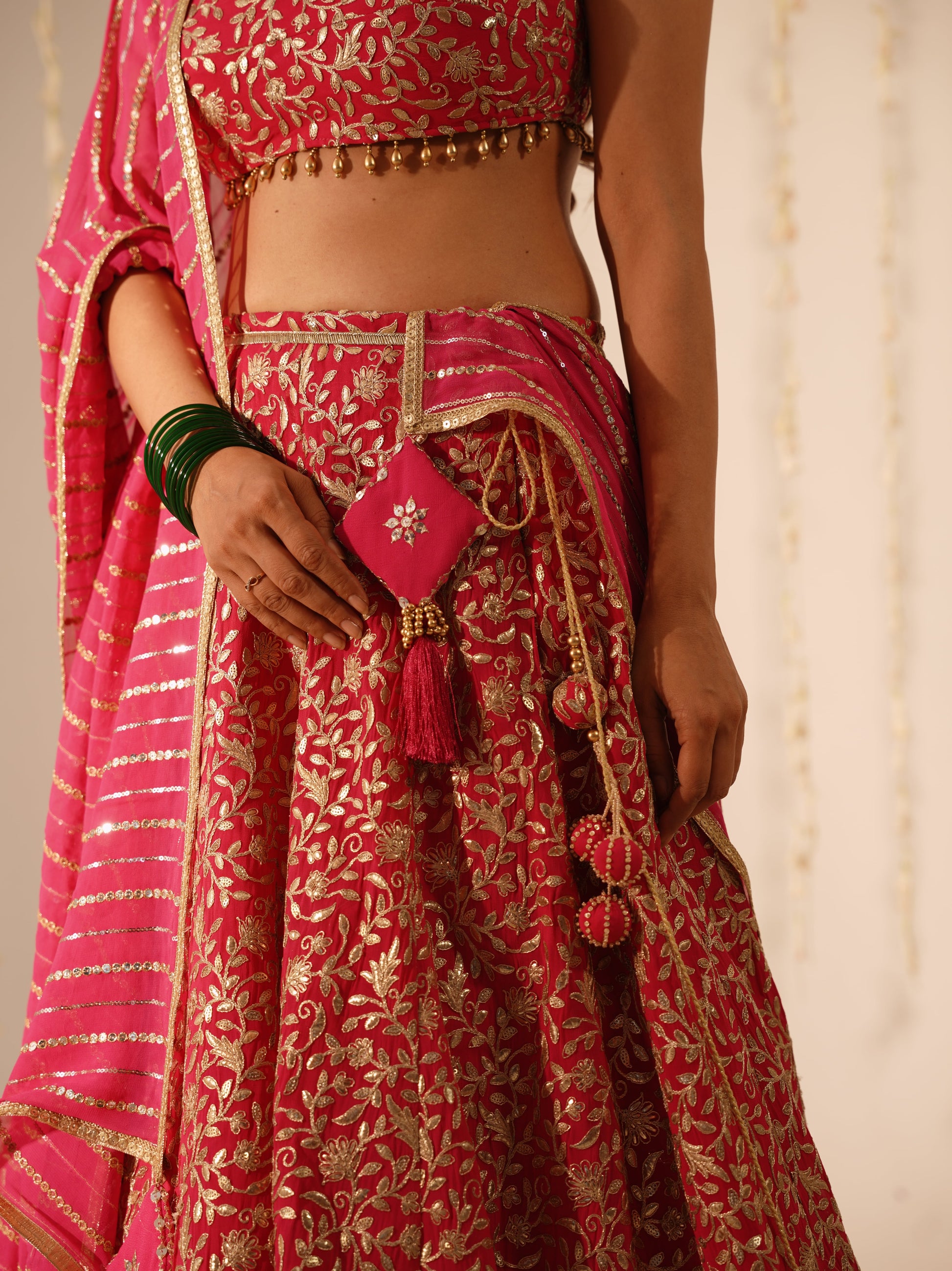 A delicate organza dupatta with pearl scalloped edges, lending a dreamy and romantic finish.