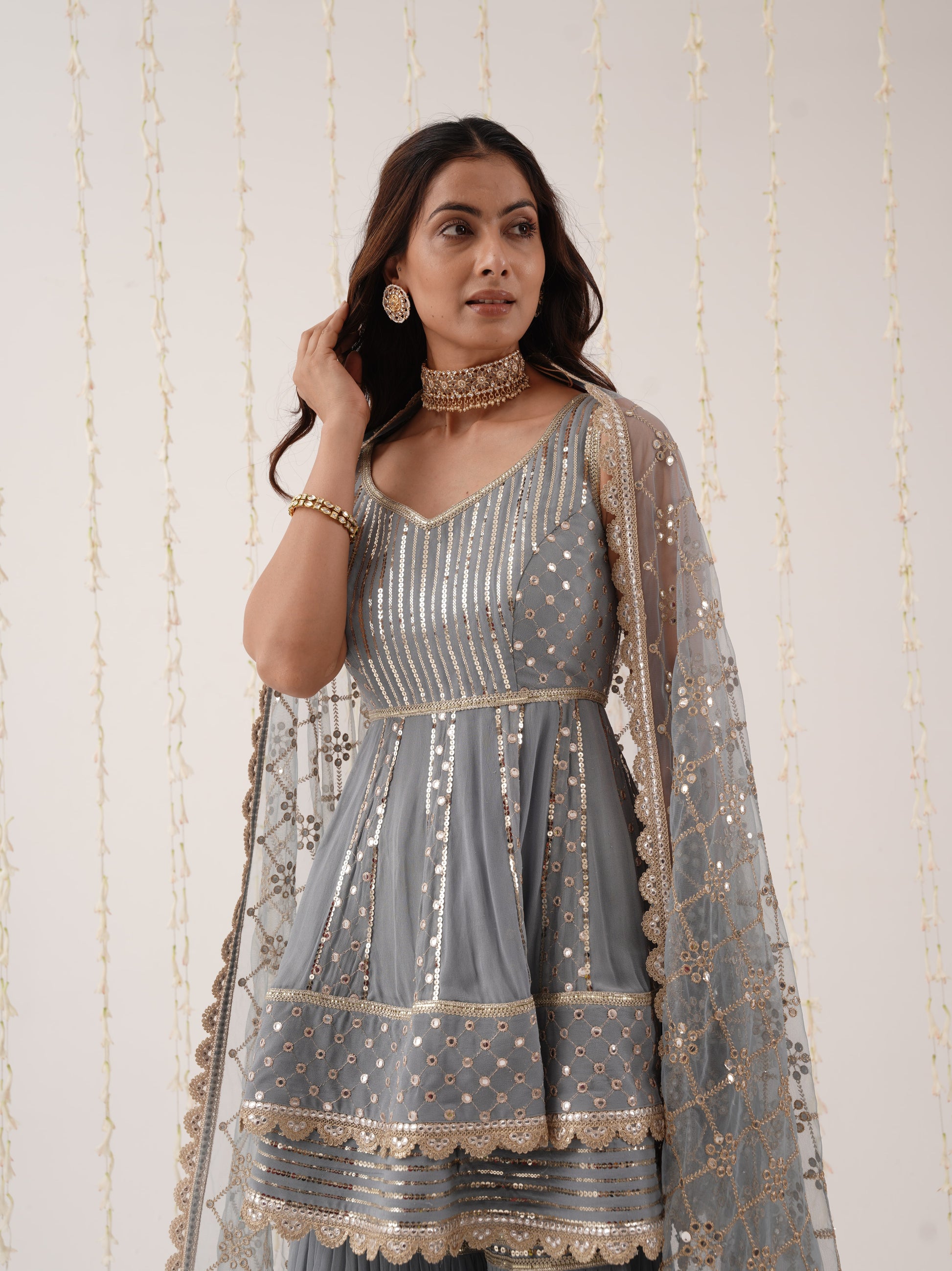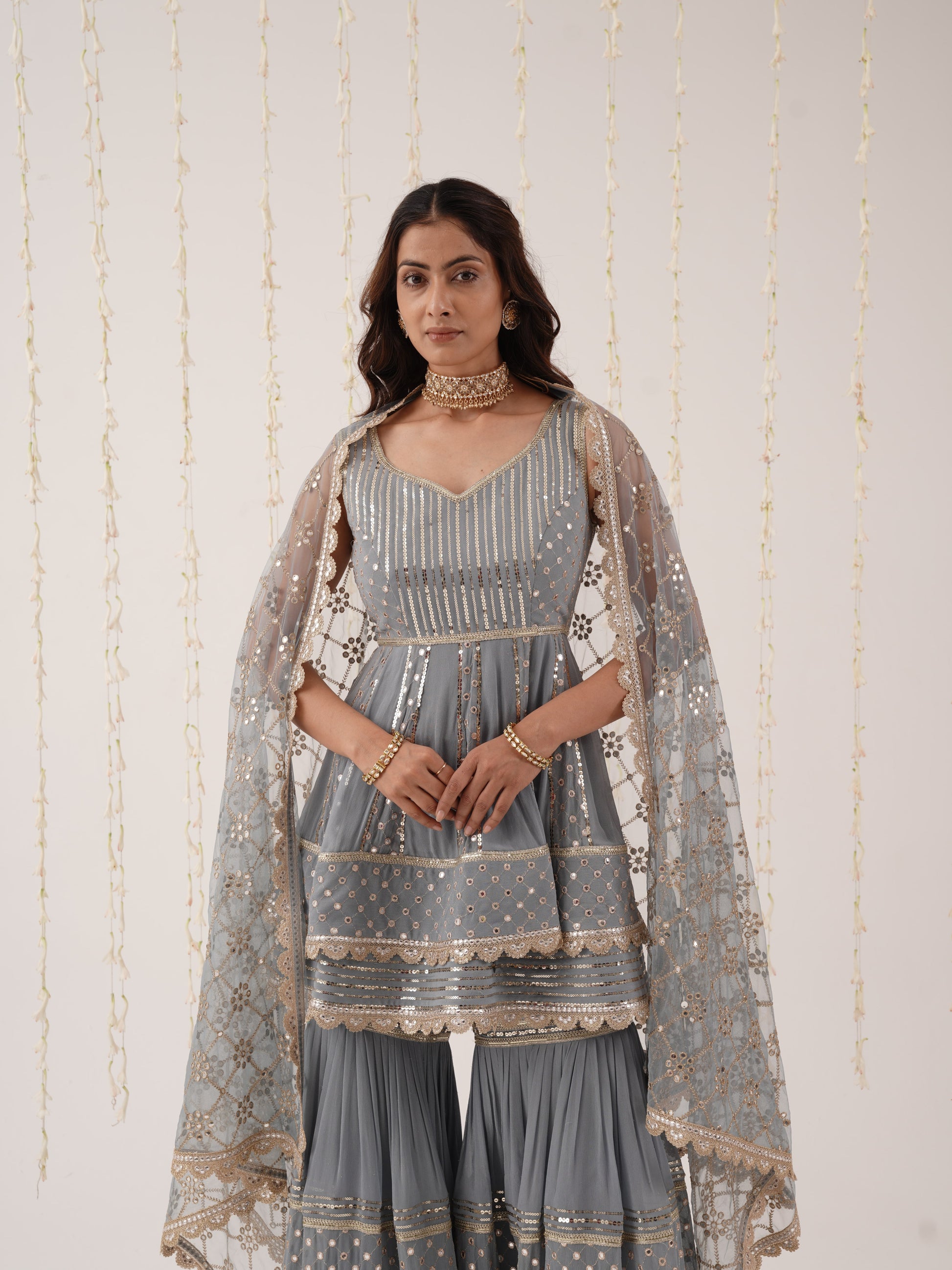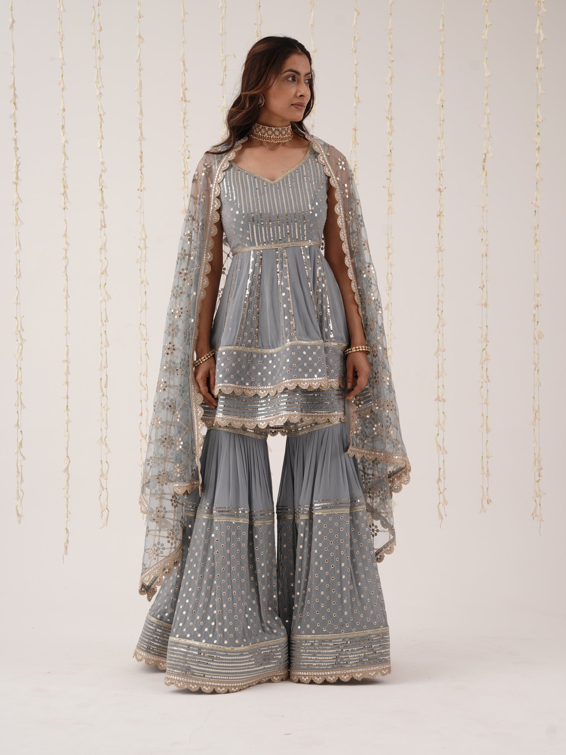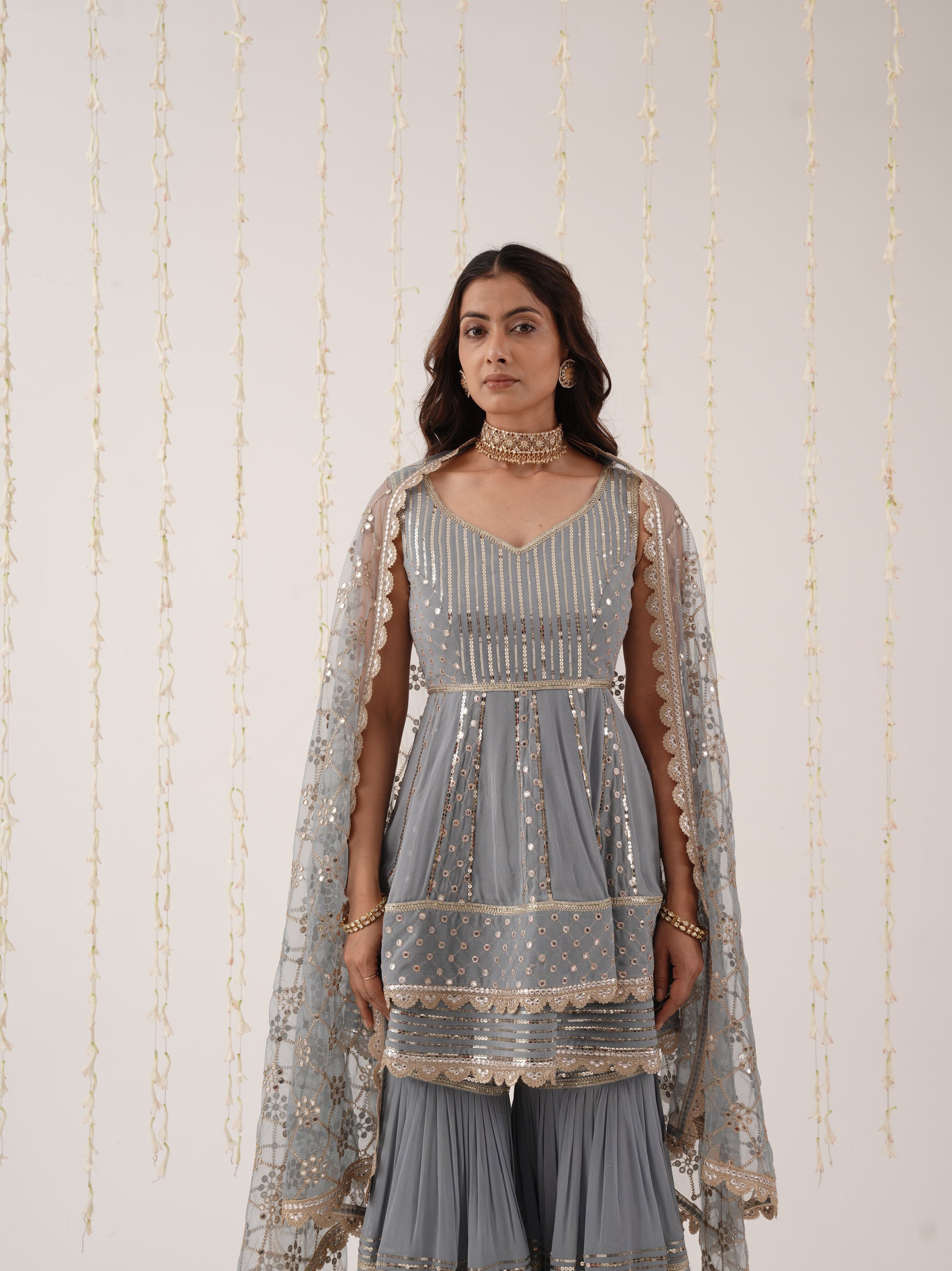 A unique double bordered peplum kurta with reflective sequins and mirror effect sequin work in creating linear flattering lines and a scalloped hem