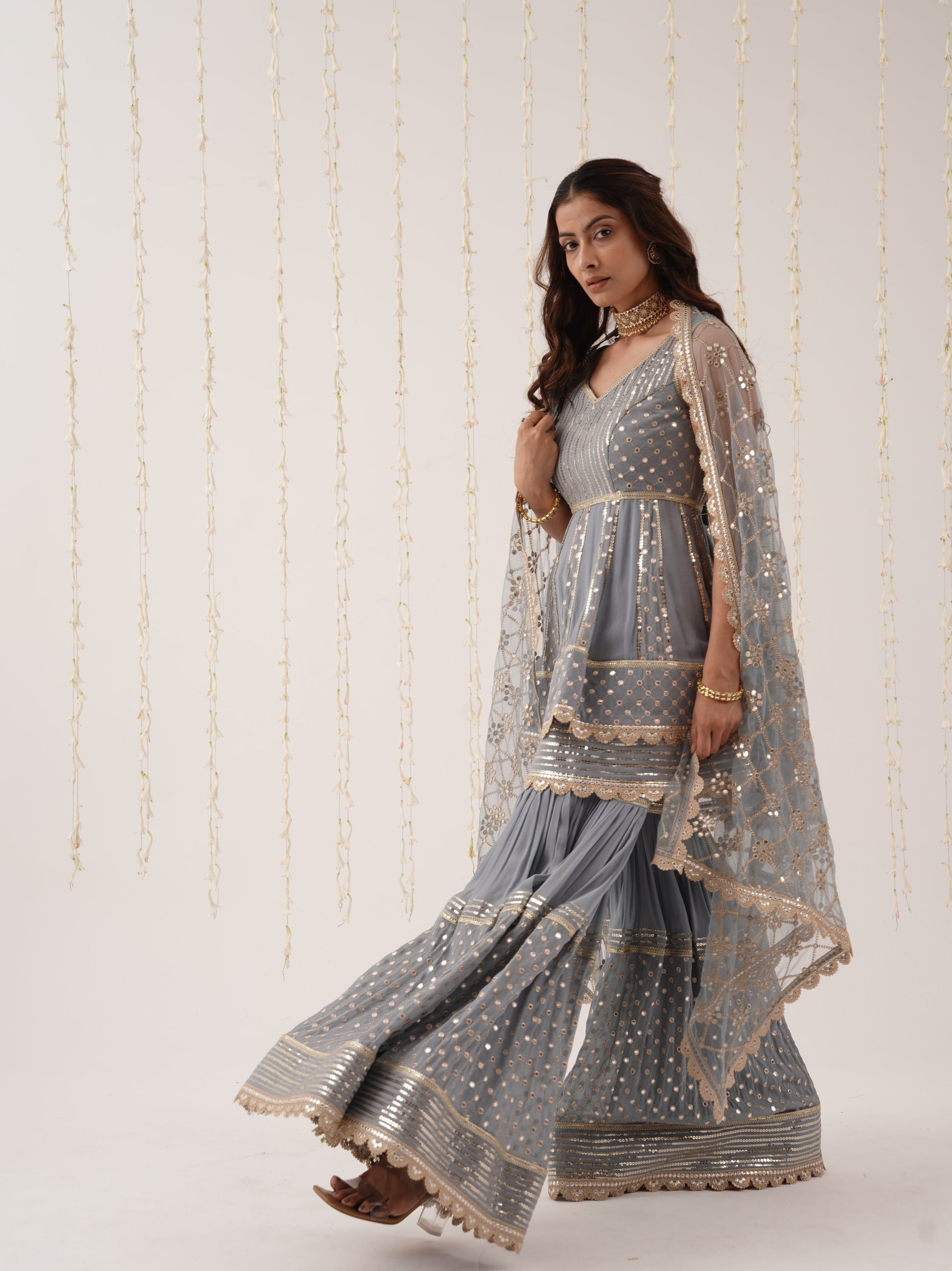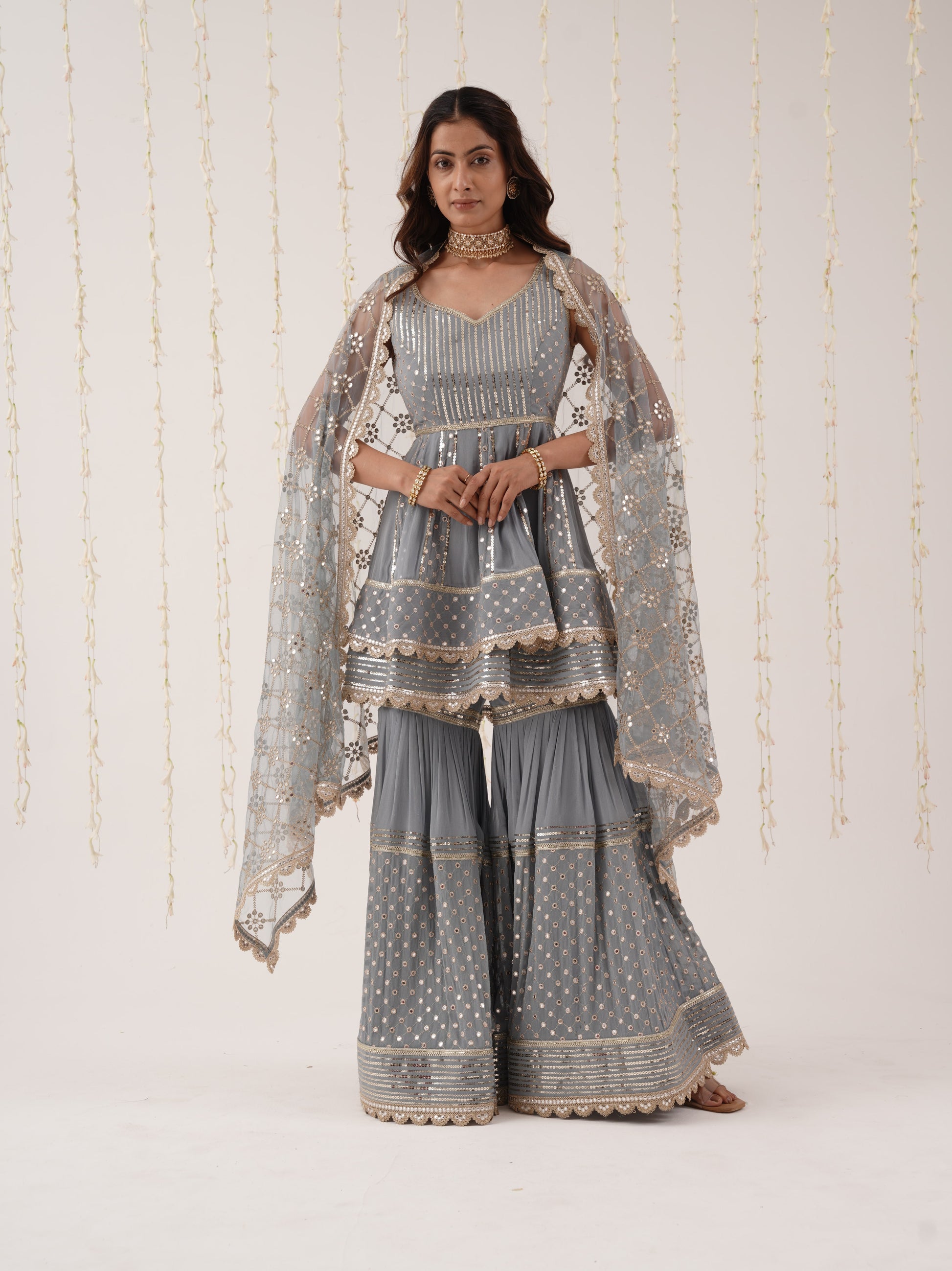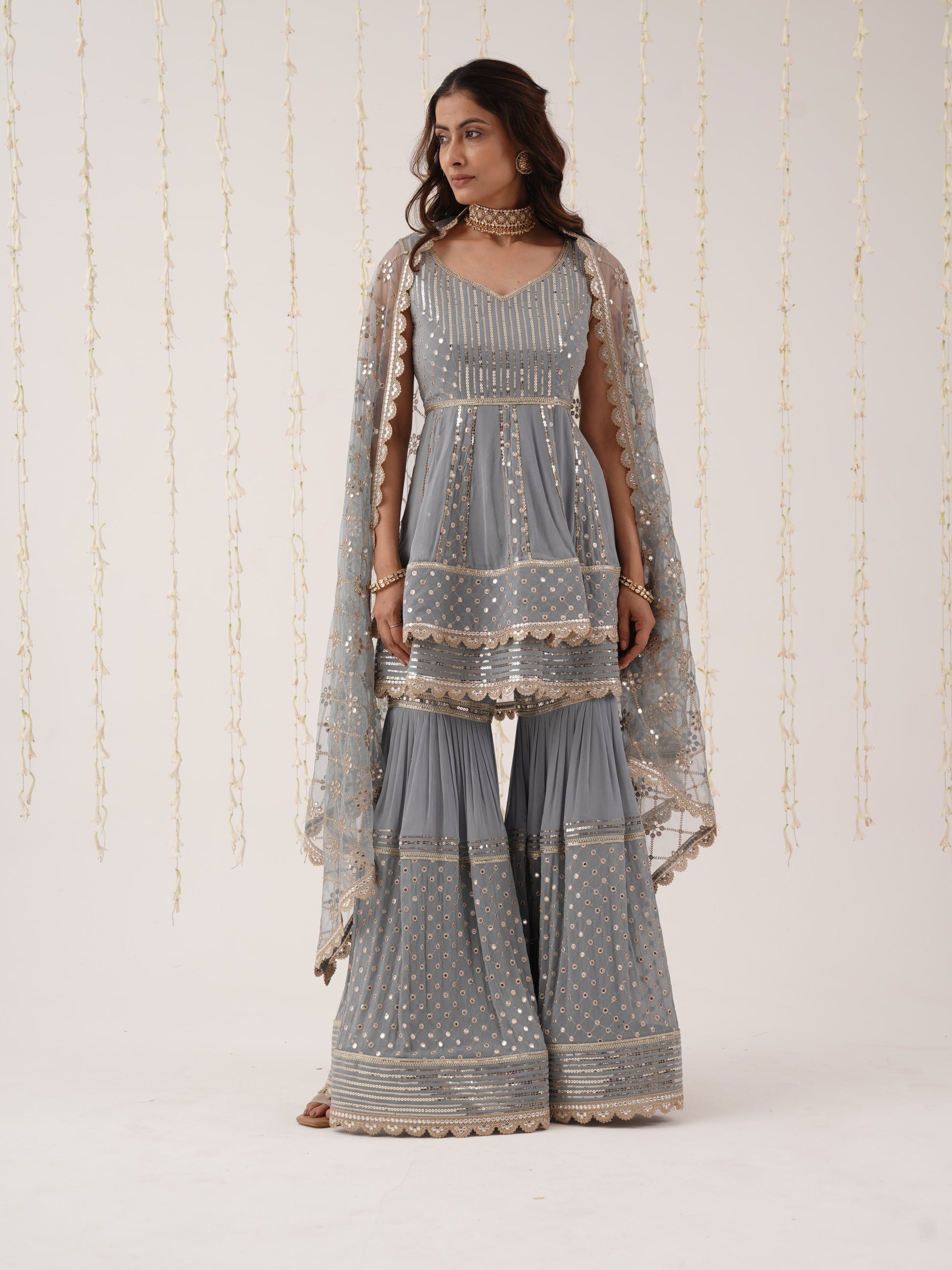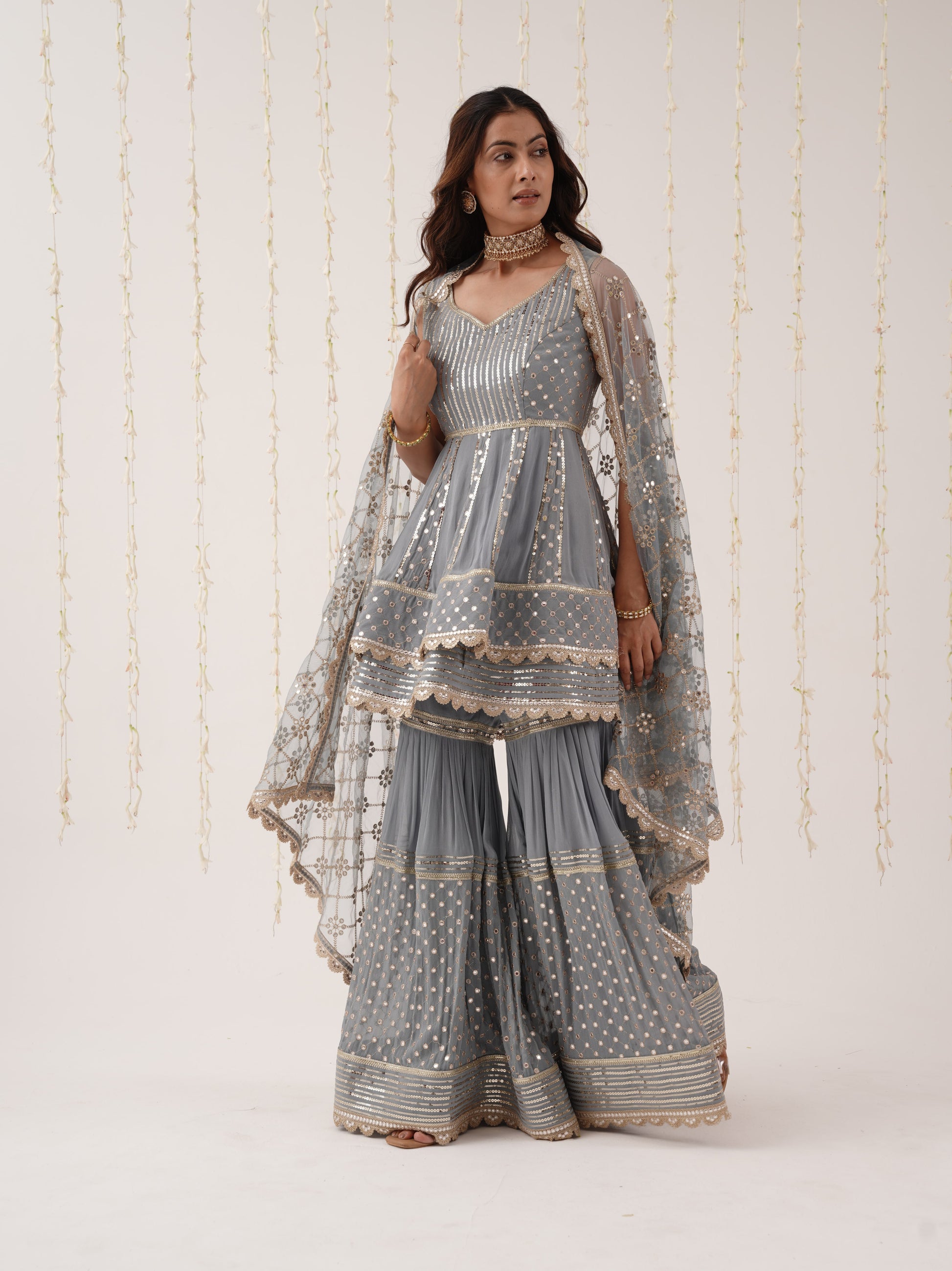 A unique double bordered peplum kurta with reflective sequins and mirror effect sequin work in creating linear flattering lines and a scalloped hem
