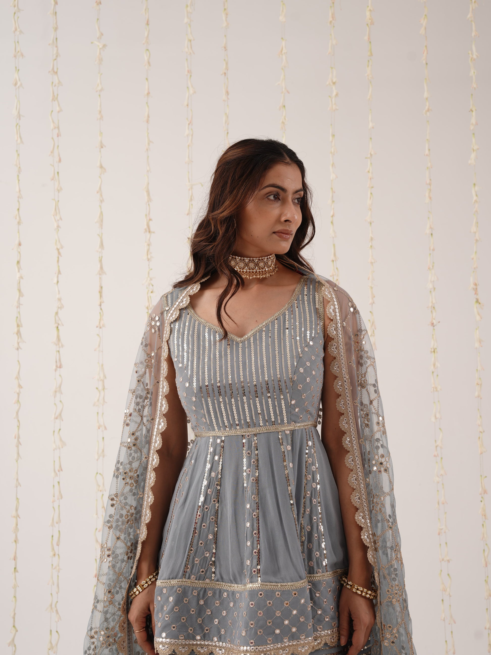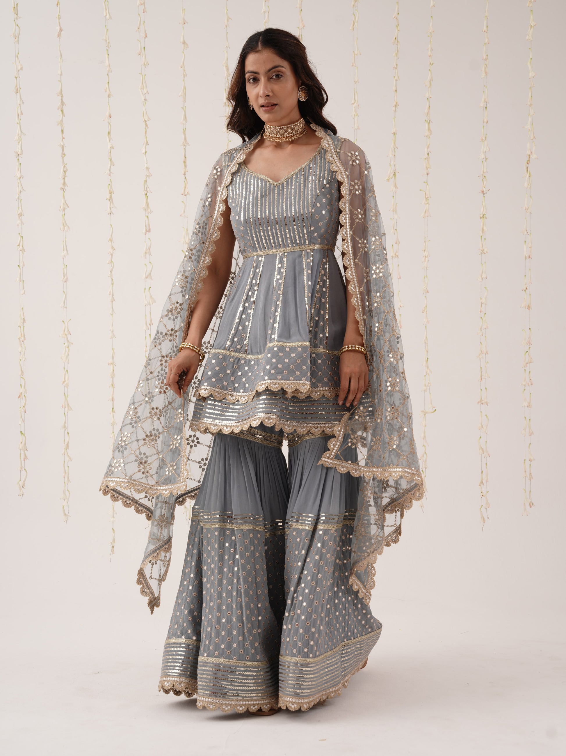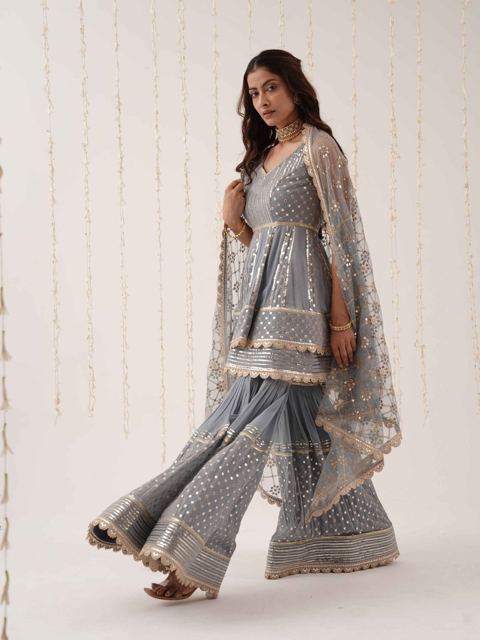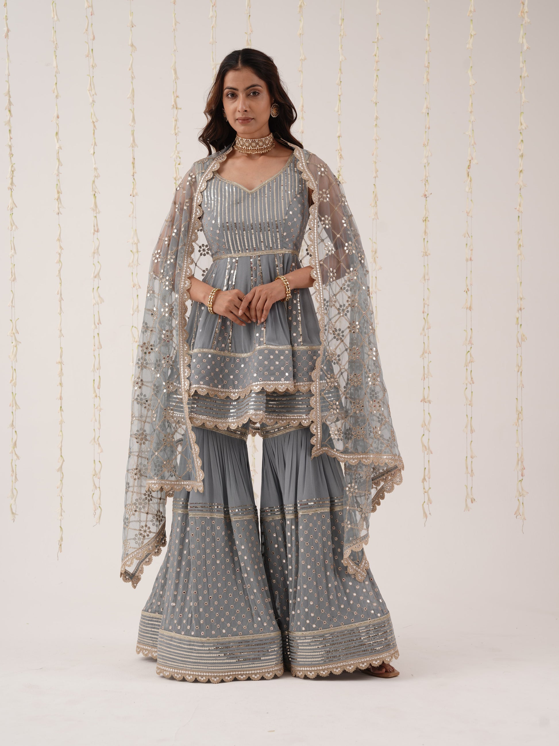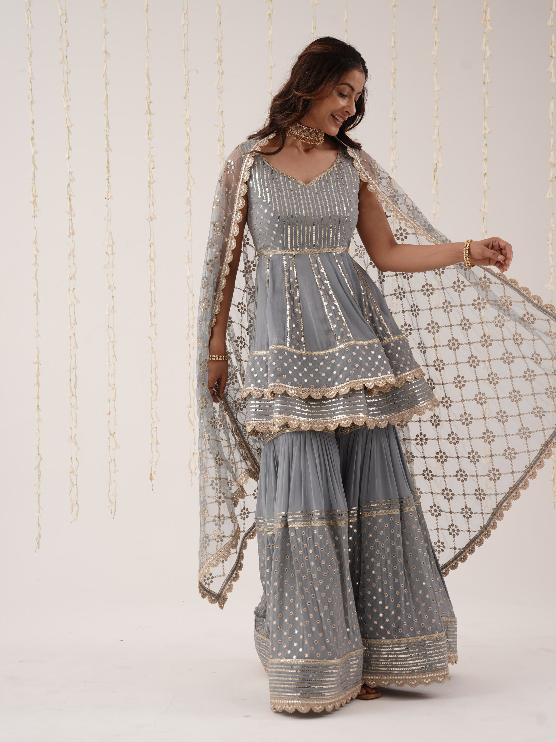 A unique double bordered peplum kurta with reflective sequins and mirror effect sequin work in creating linear flattering lines and a scalloped hem