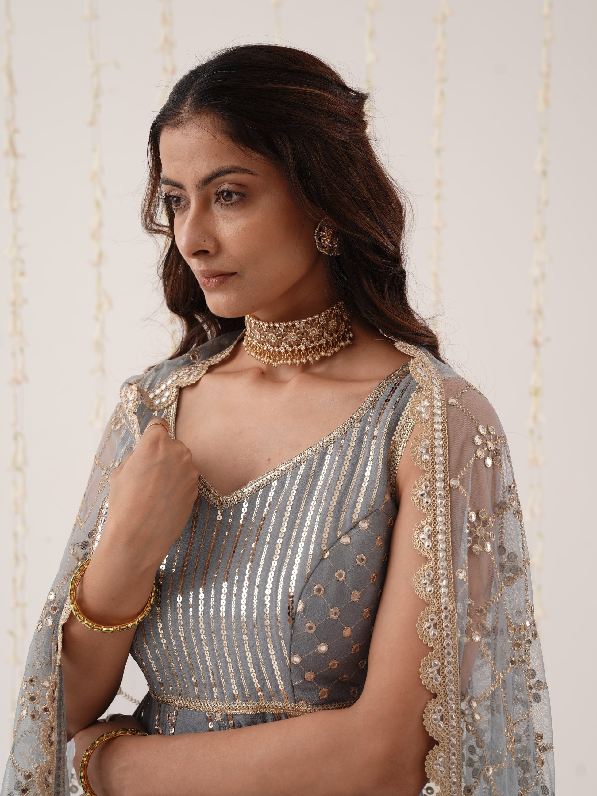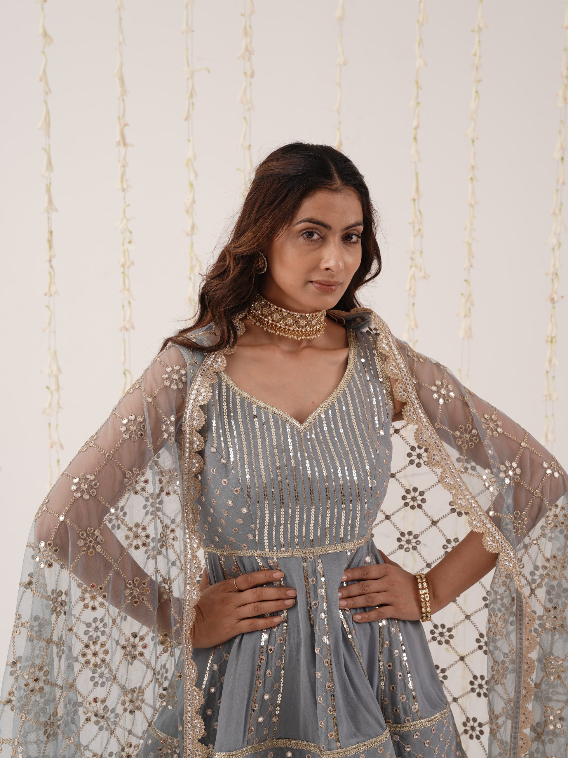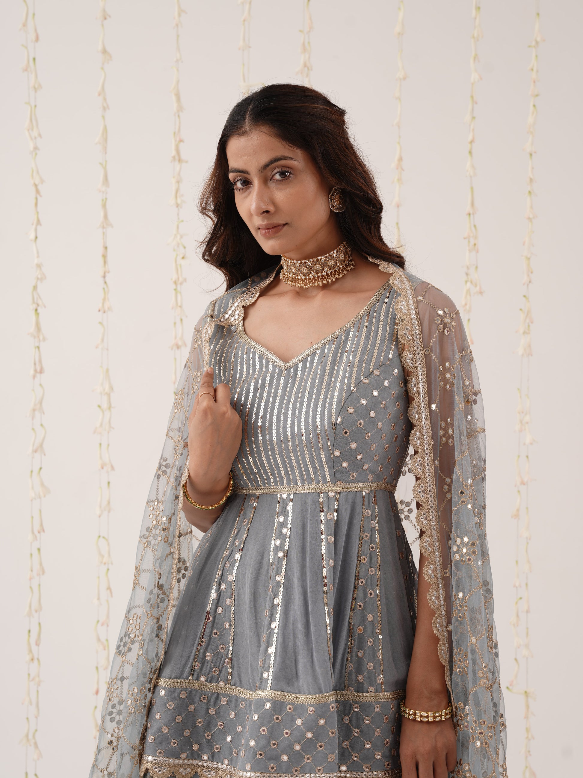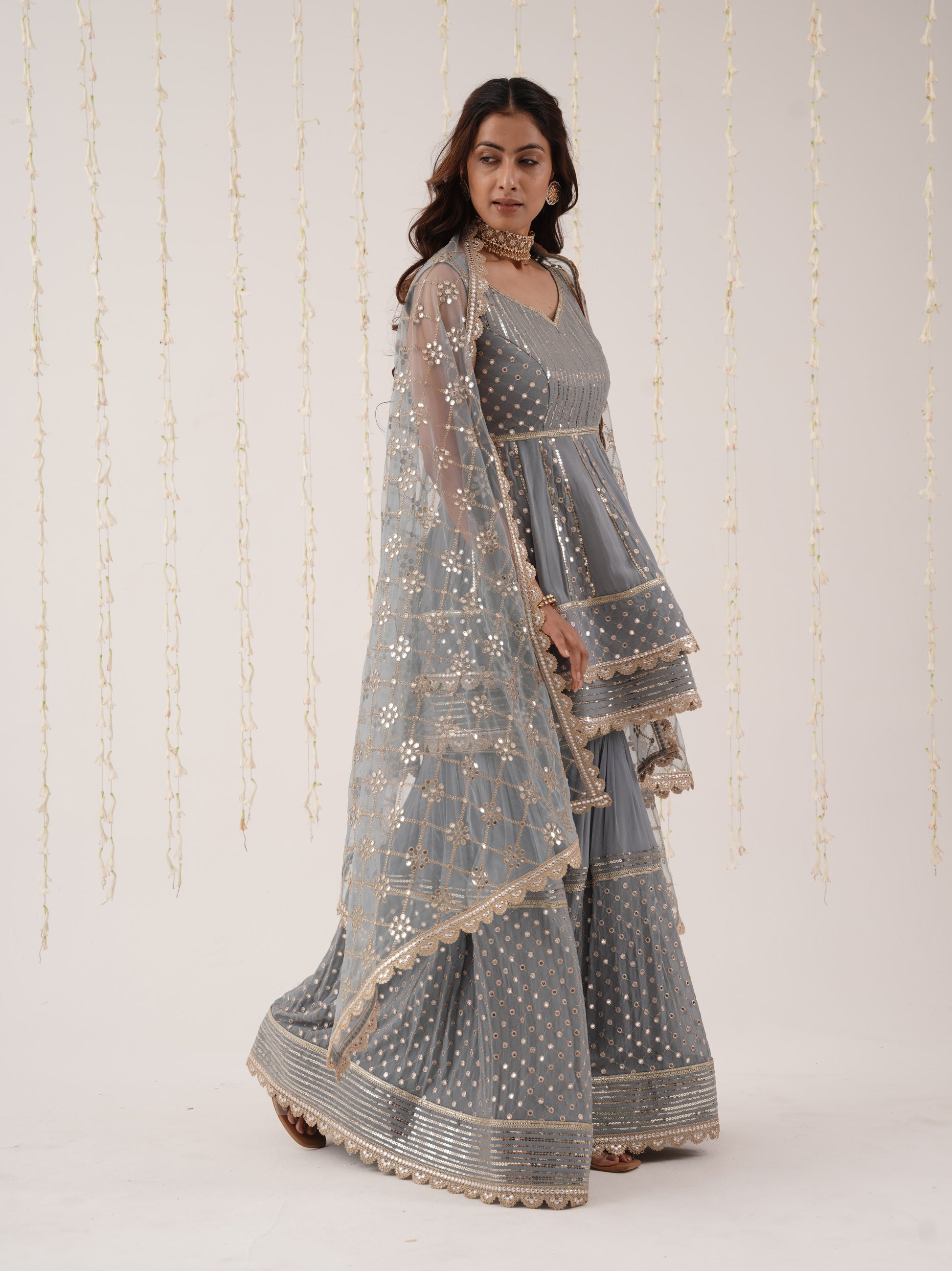 A unique double bordered peplum kurta with reflective sequins and mirror effect sequin work in creating linear flattering lines and a scalloped hem