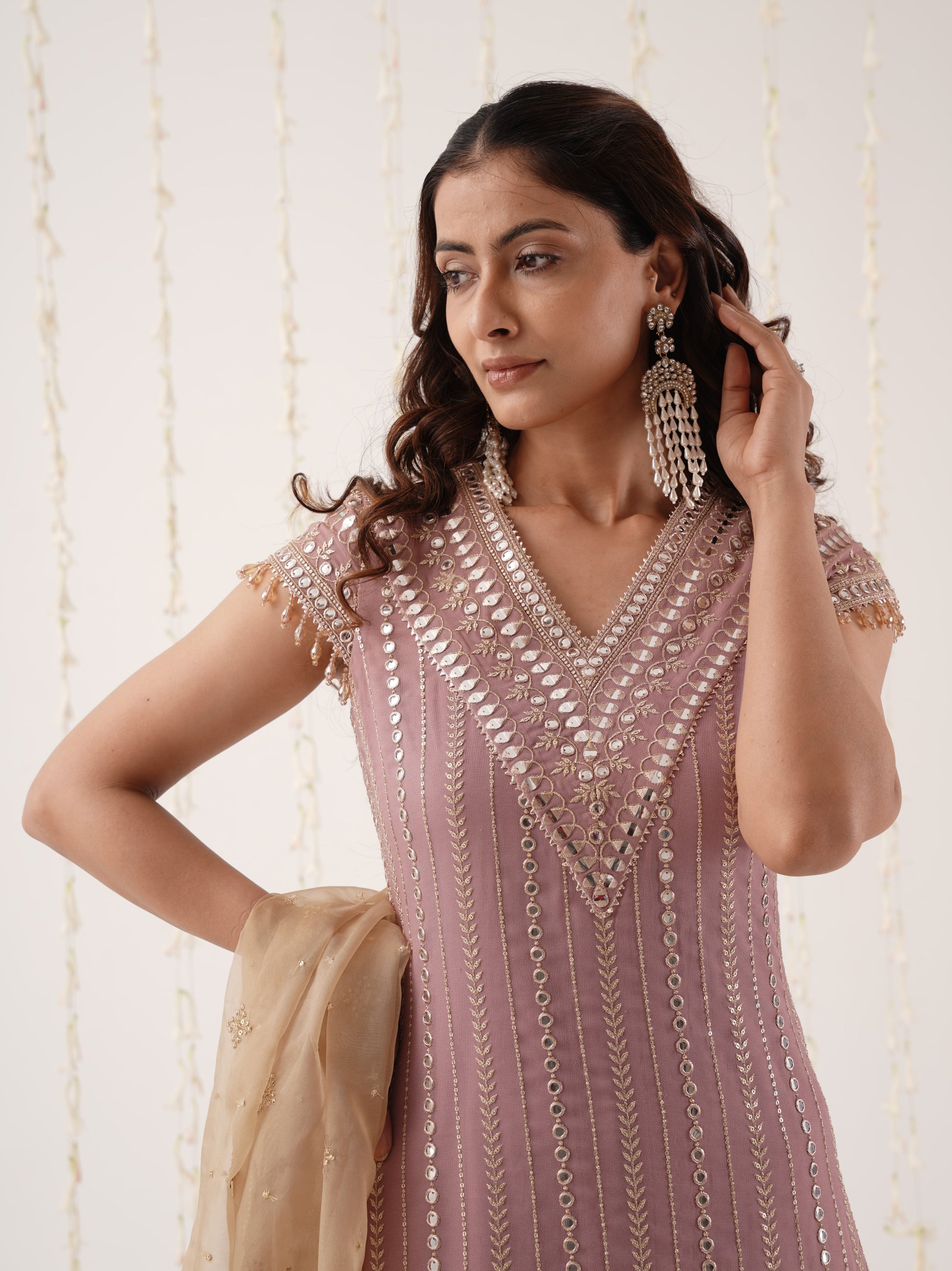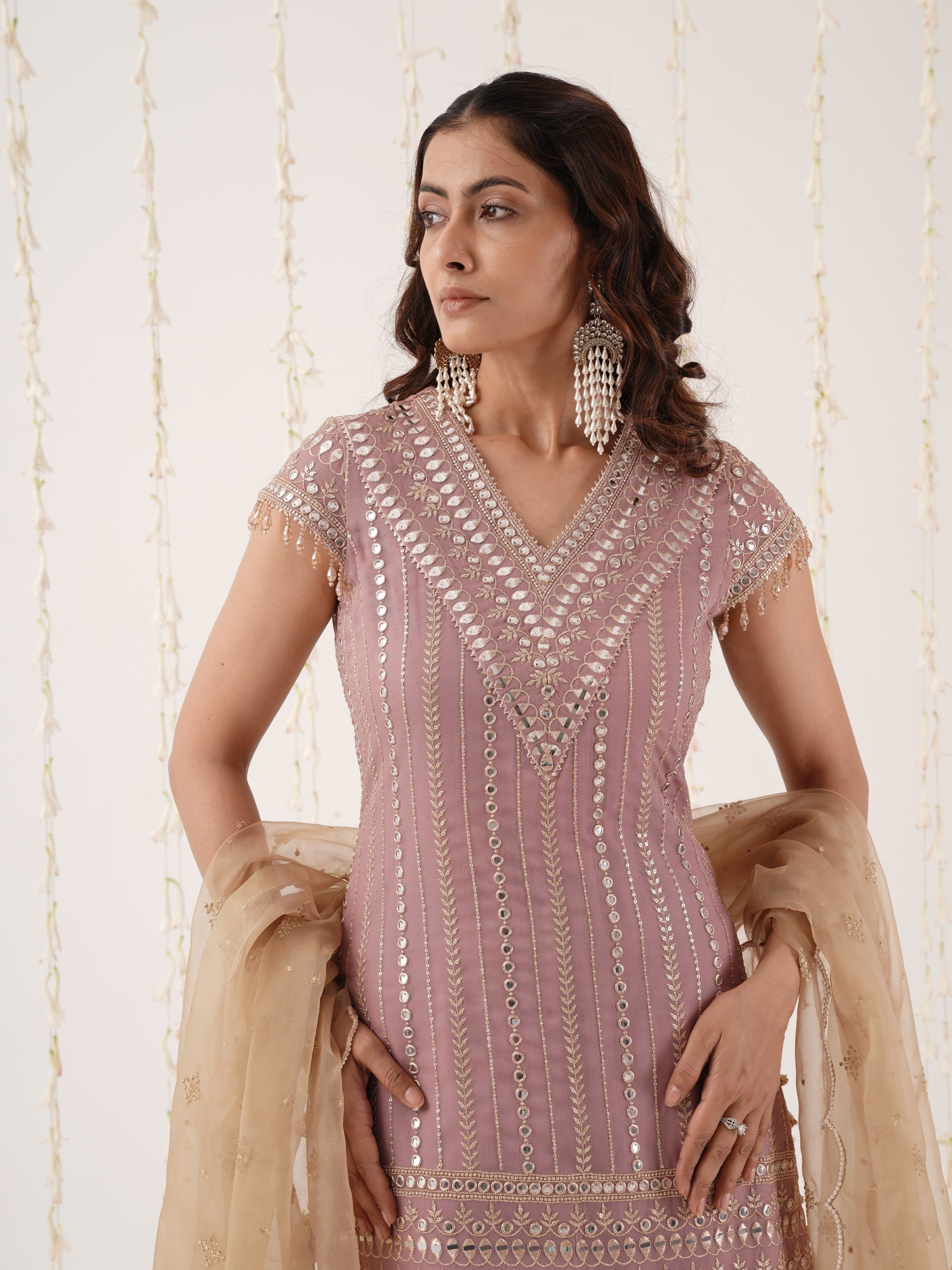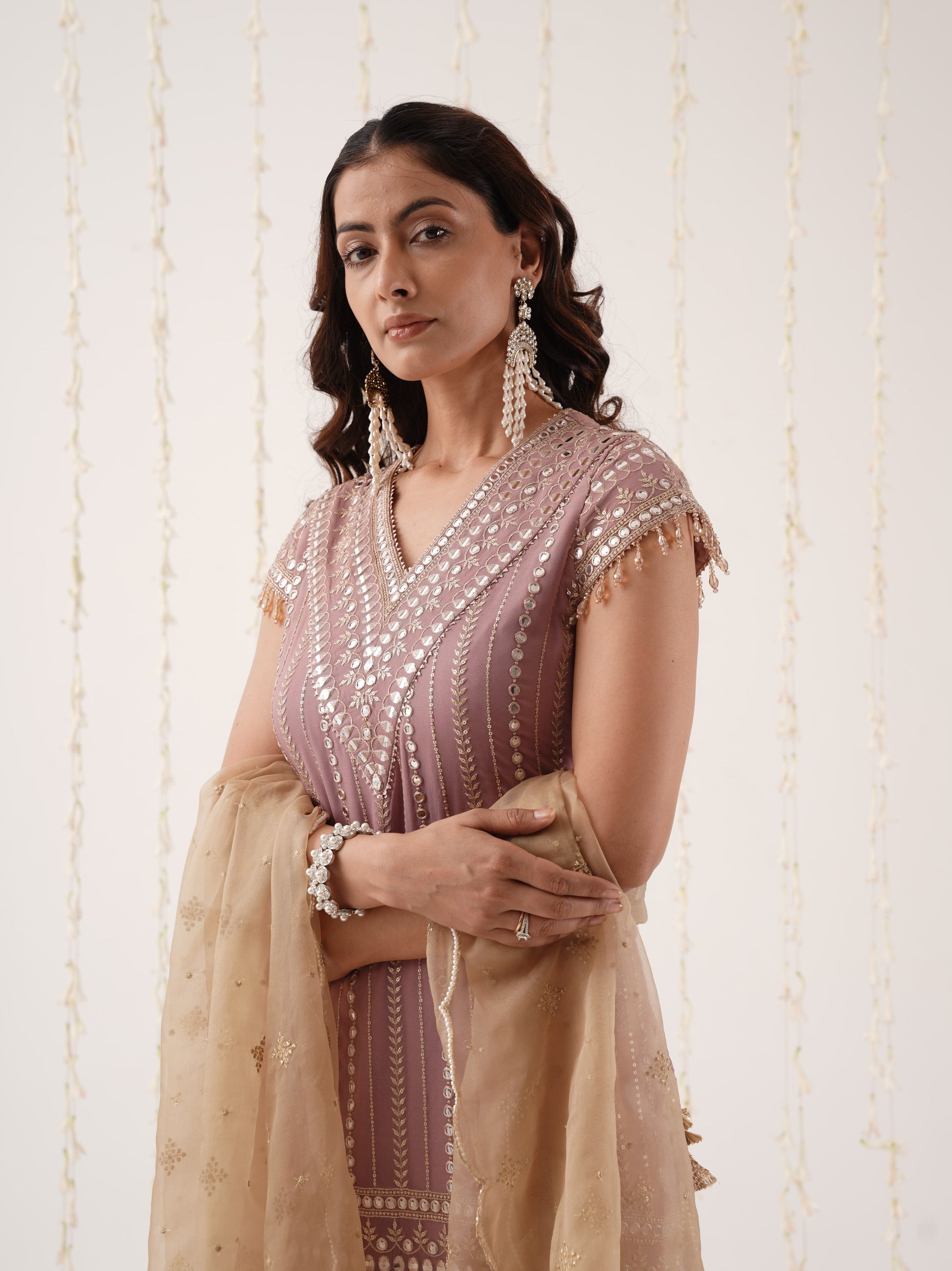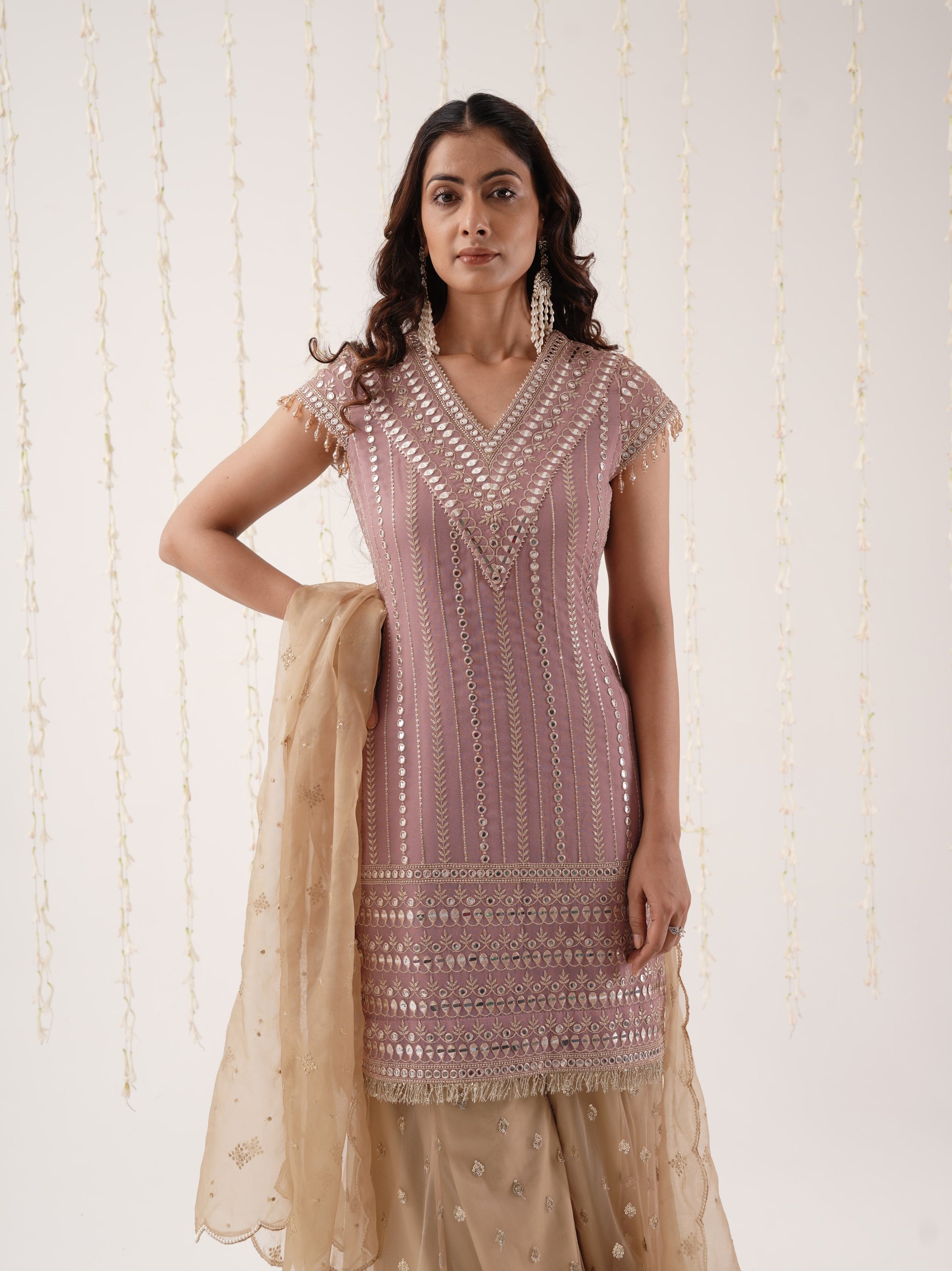A chateau rose kurta cut in a classic V-neck silhouette, adorned with mirror-effect sequin embroidery in clean geometric lines. Finished with fringe scallop edging and delicate side tassels for a playful twist.
