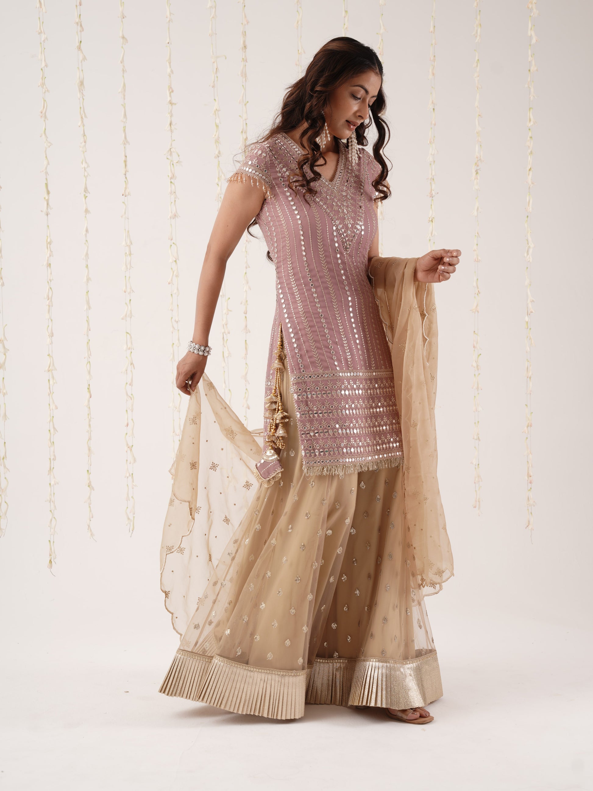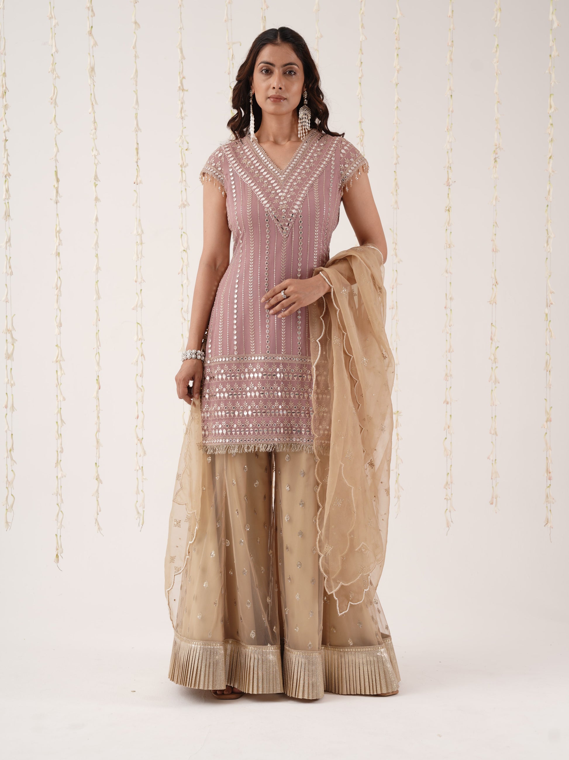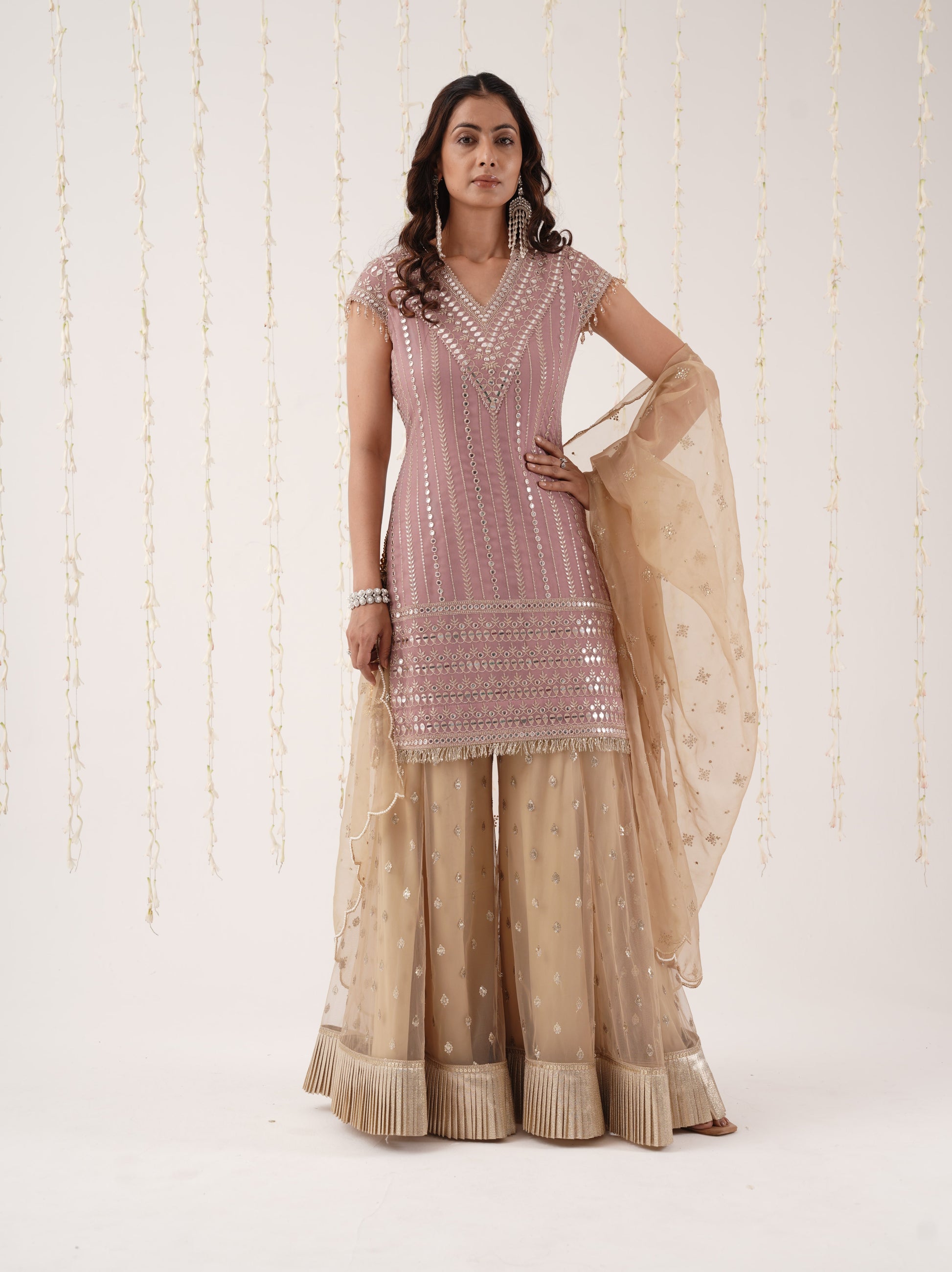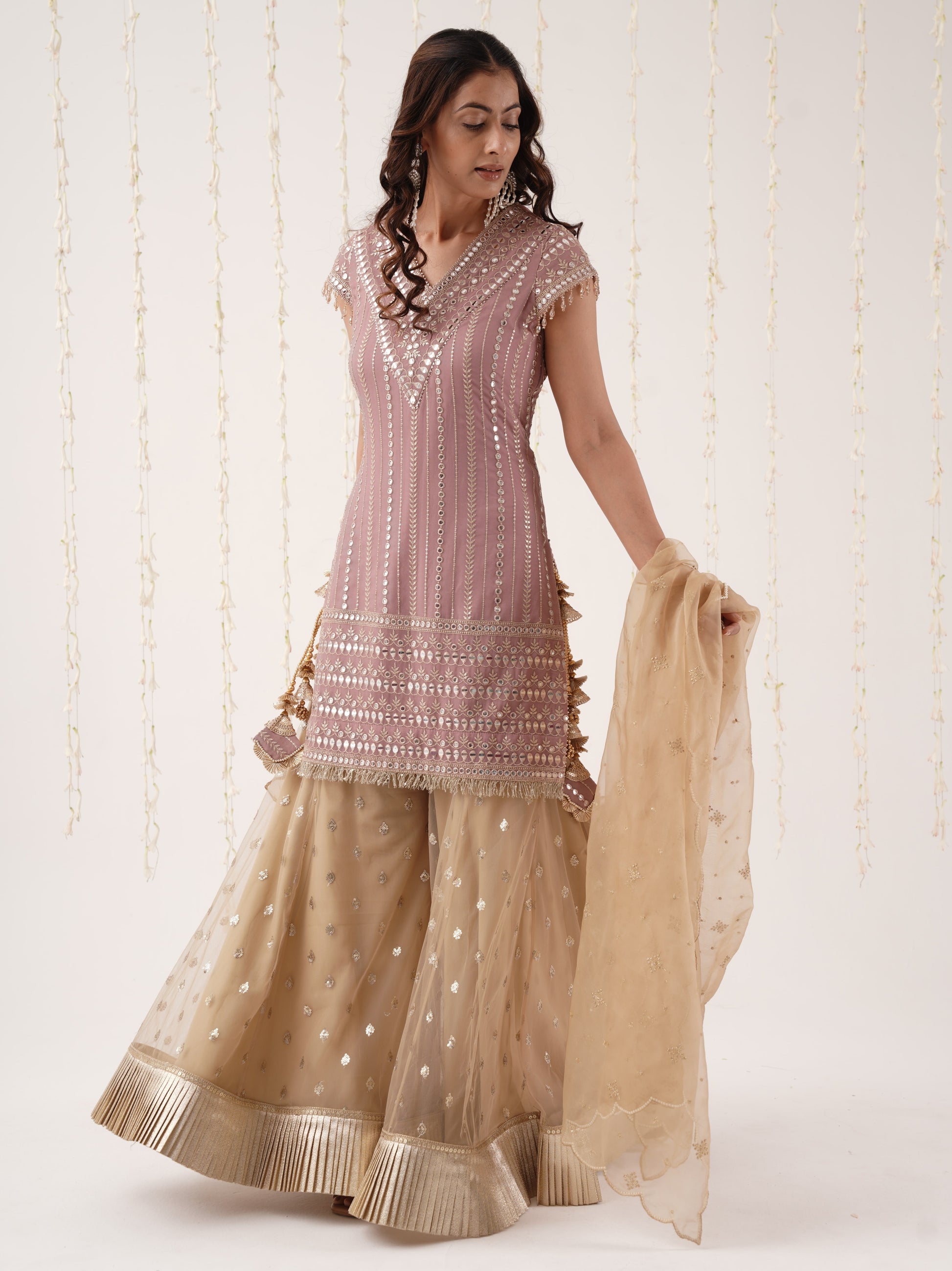 A chateau rose kurta cut in a classic V-neck silhouette, adorned with mirror-effect sequin embroidery in clean geometric lines. Finished with fringe scallop edging and delicate side tassels for a playful twist.