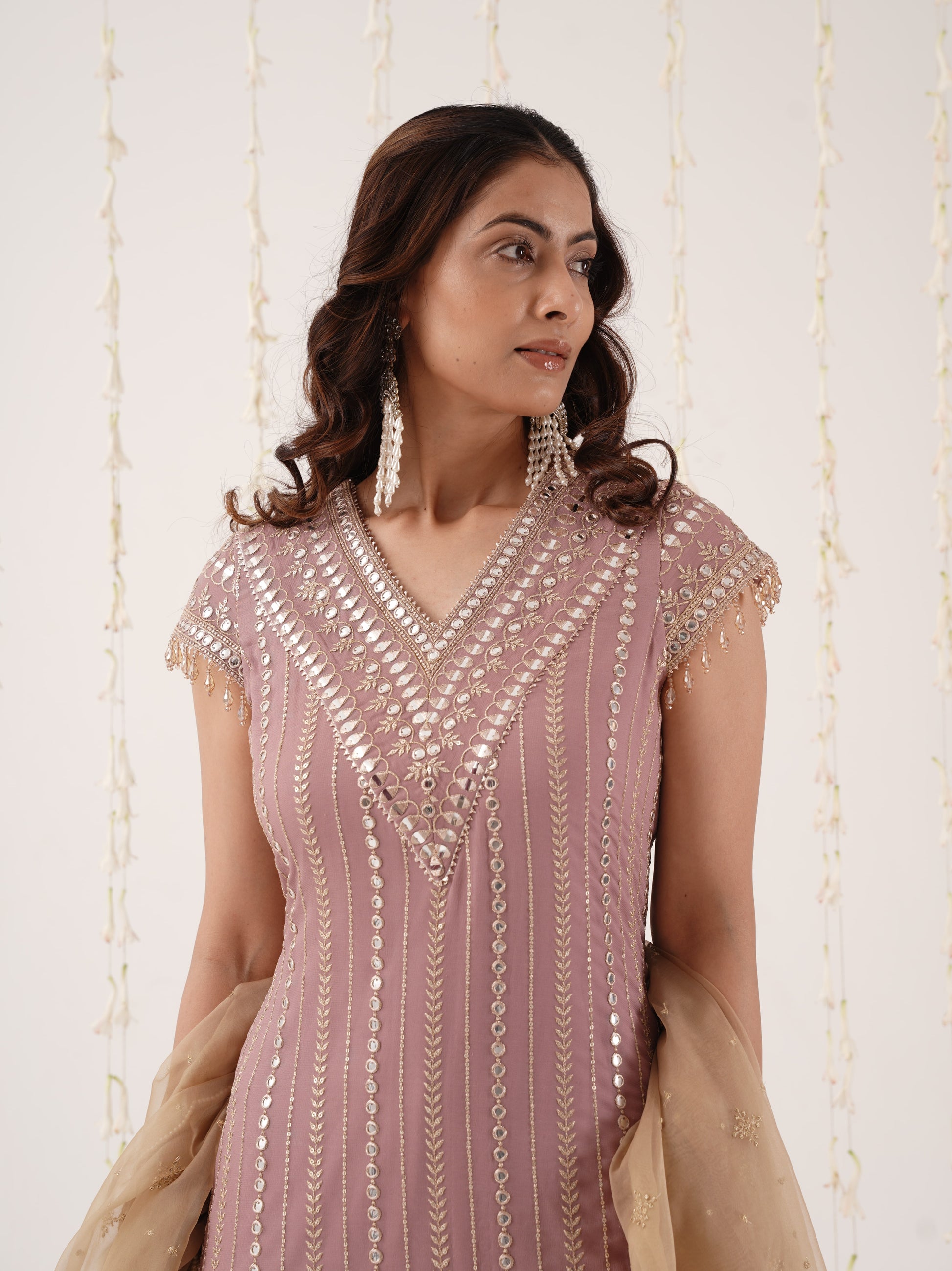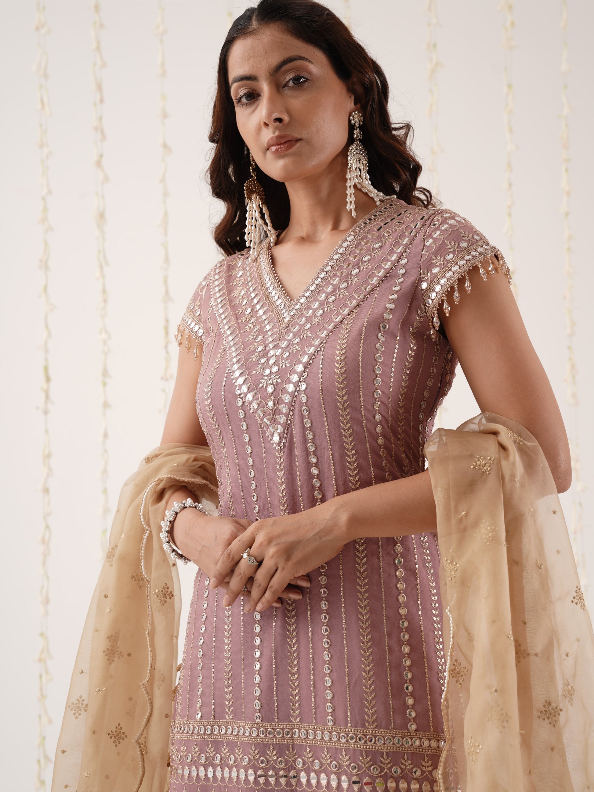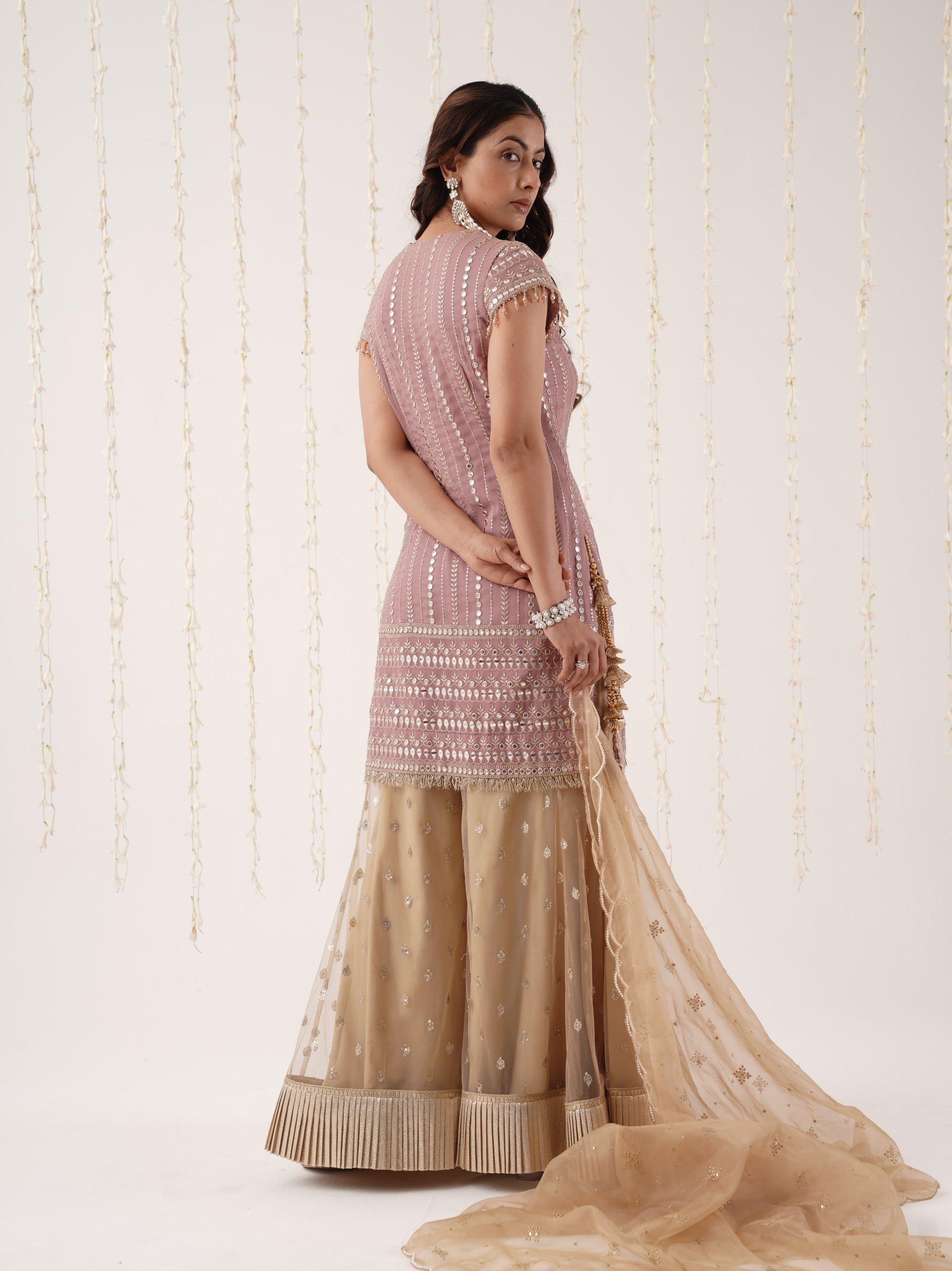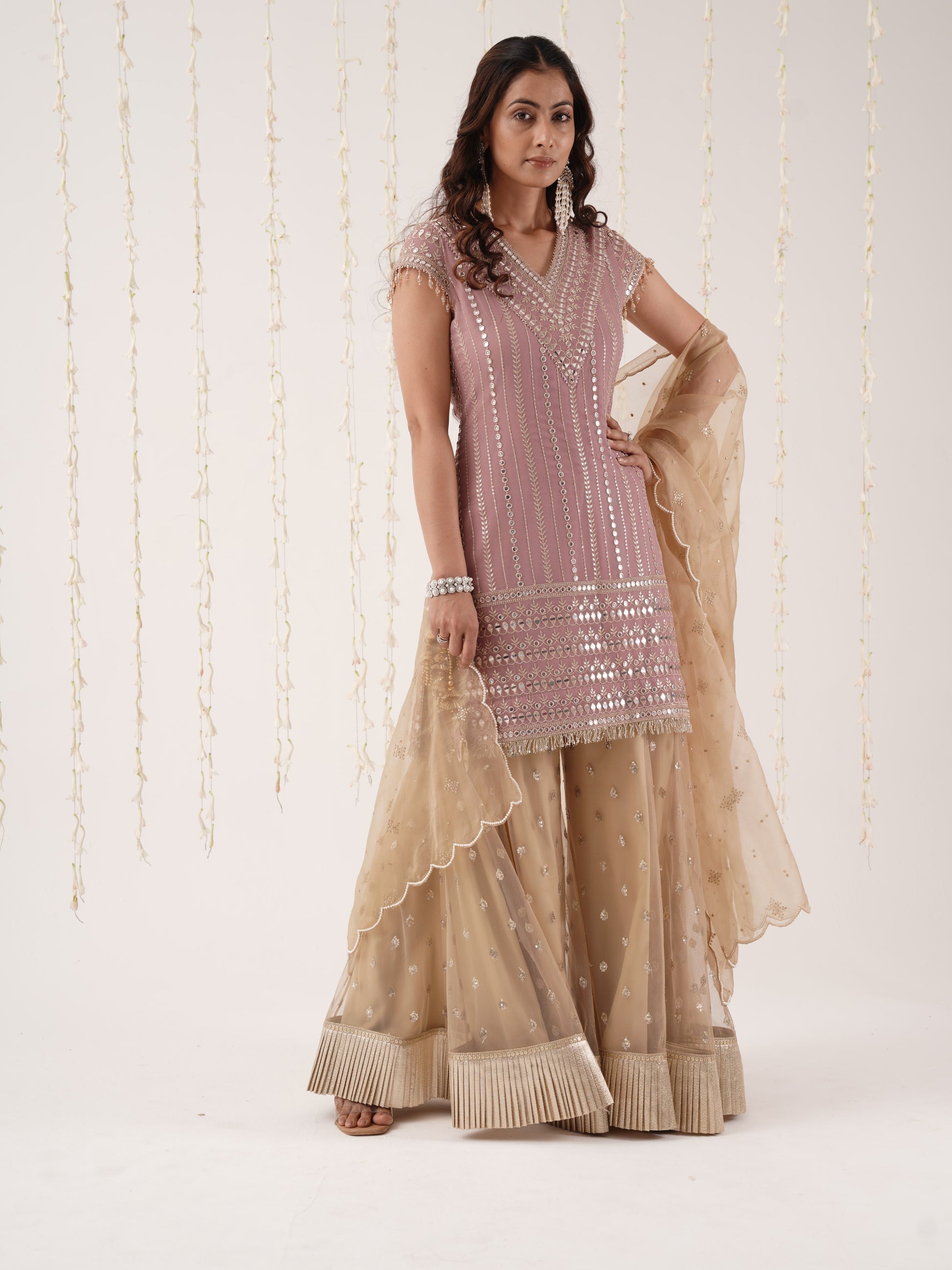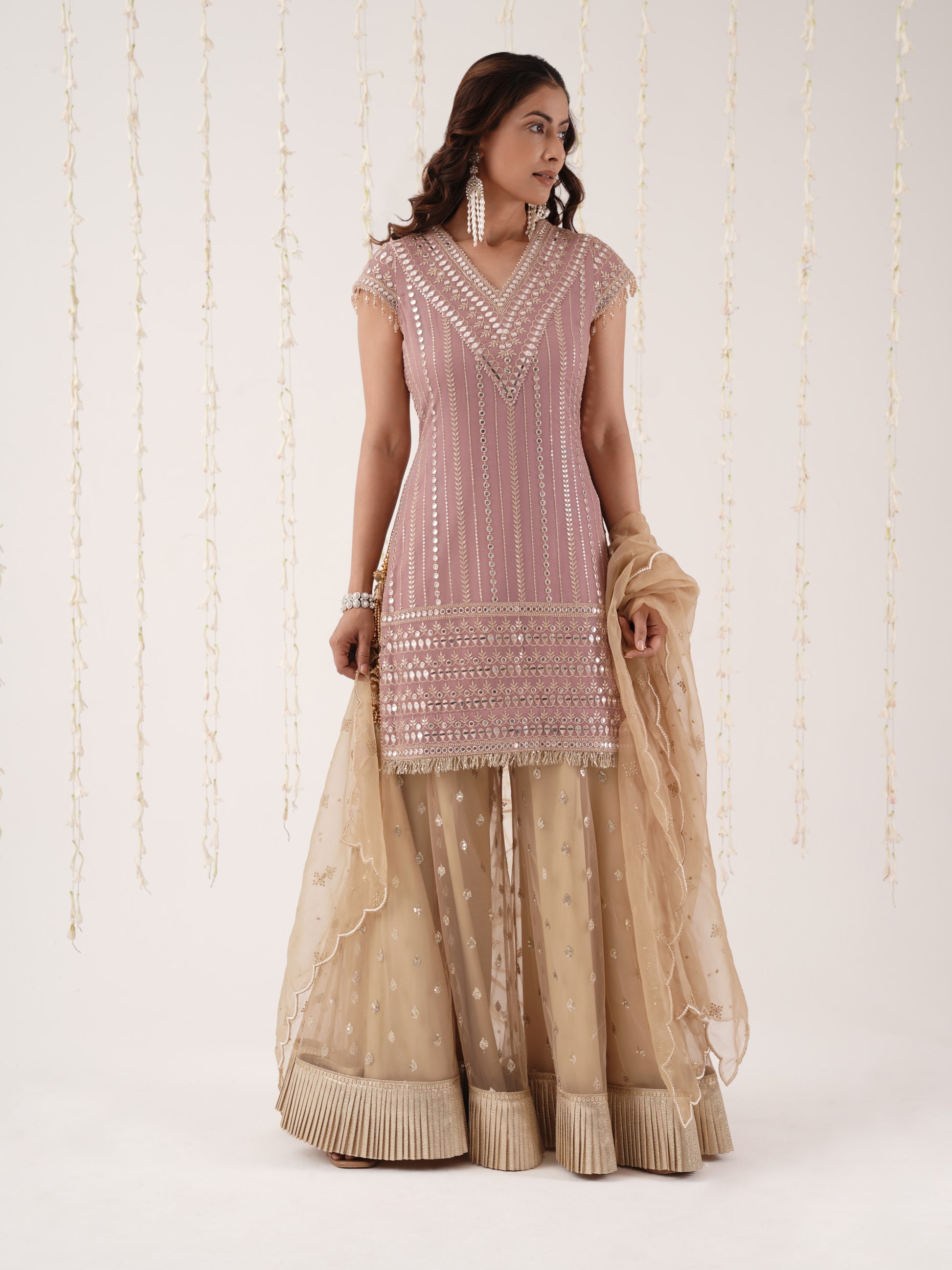 A chateau rose kurta cut in a classic V-neck silhouette, adorned with mirror-effect sequin embroidery in clean geometric lines. Finished with fringe scallop edging and delicate side tassels for a playful twist.