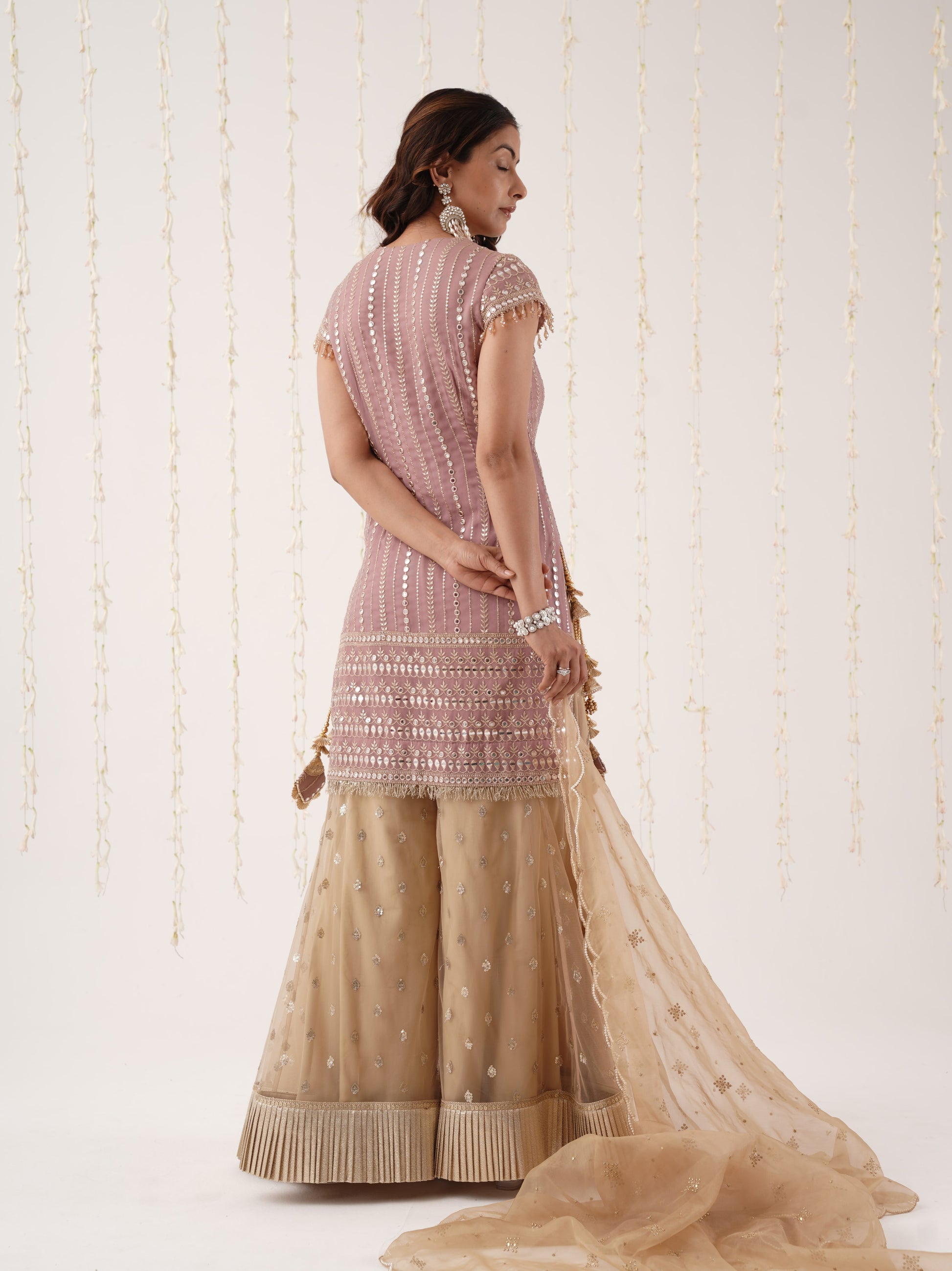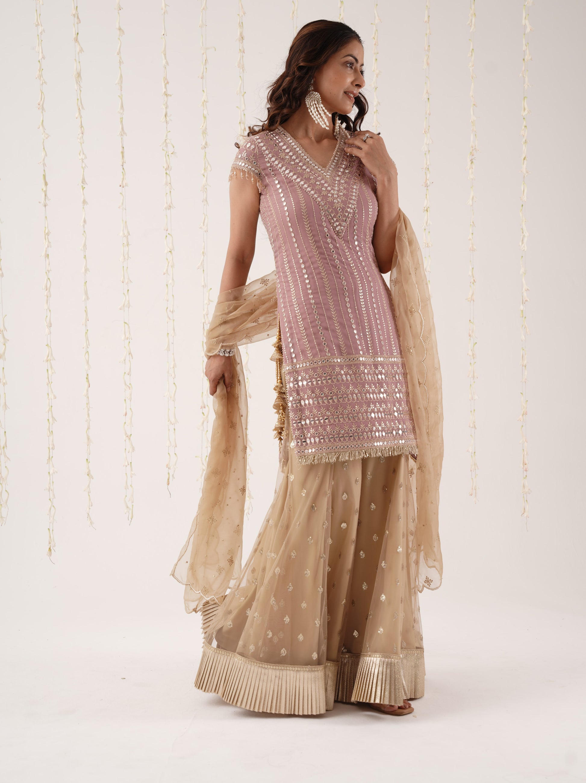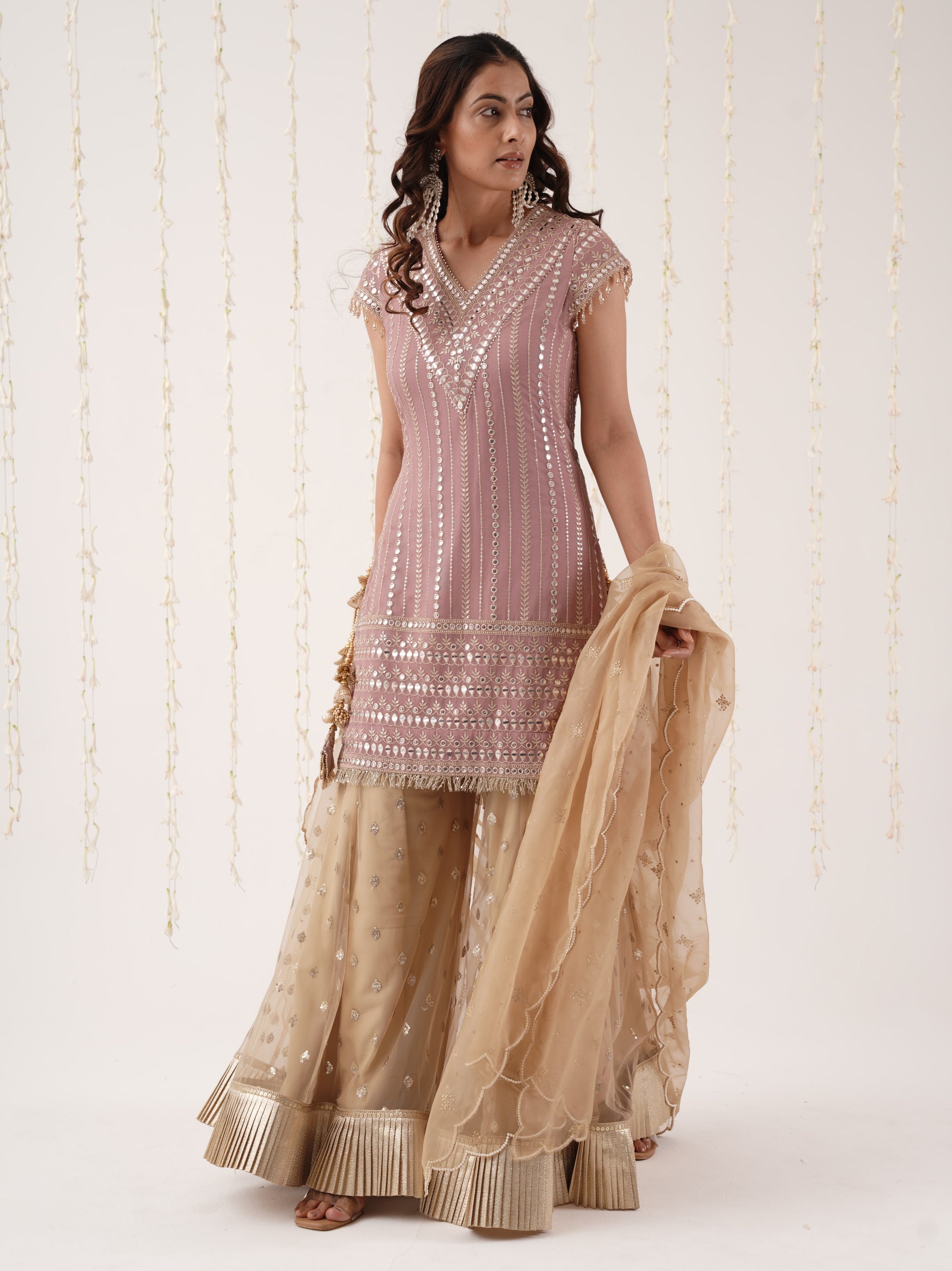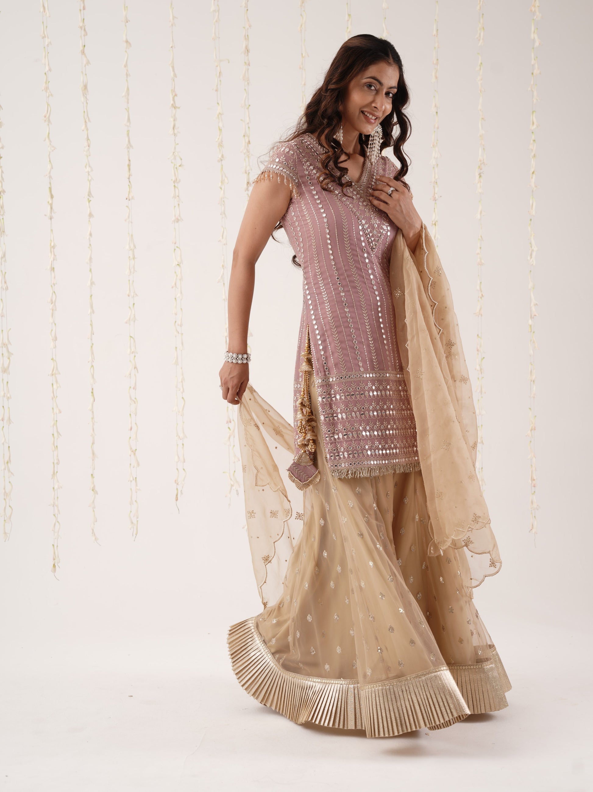 A chateau rose kurta cut in a classic V-neck silhouette, adorned with mirror-effect sequin embroidery in clean geometric lines. Finished with fringe scallop edging and delicate side tassels for a playful twist.