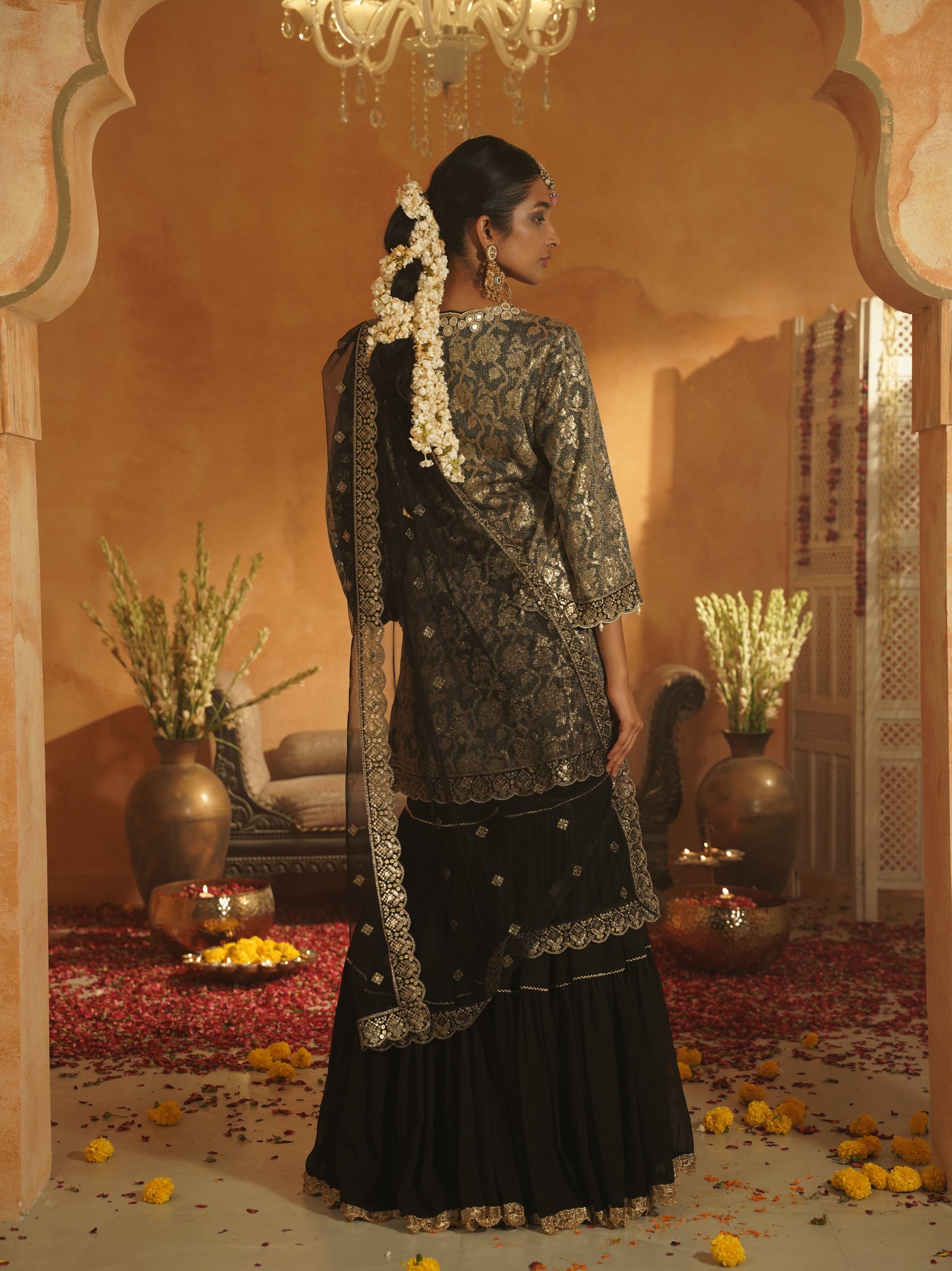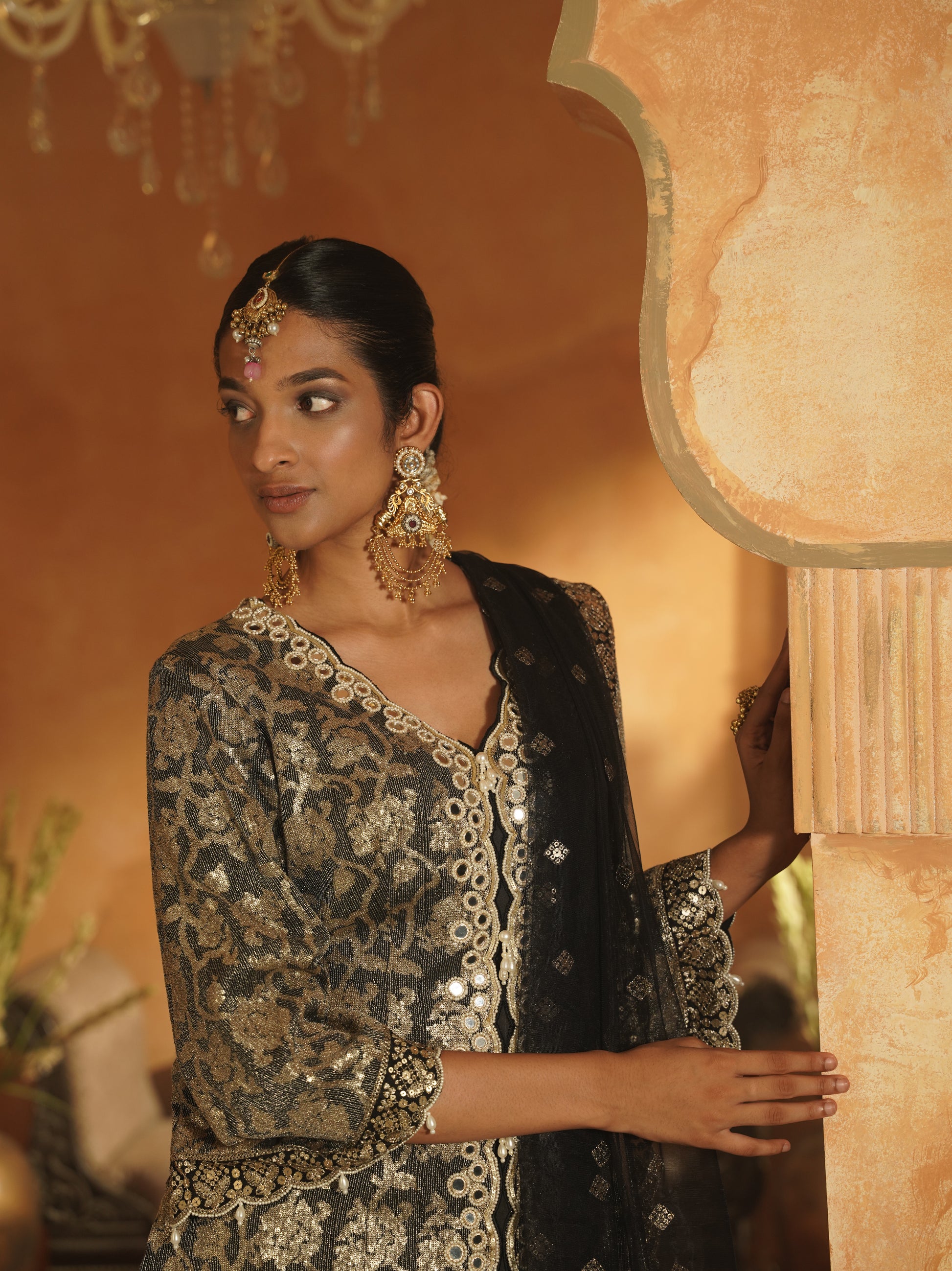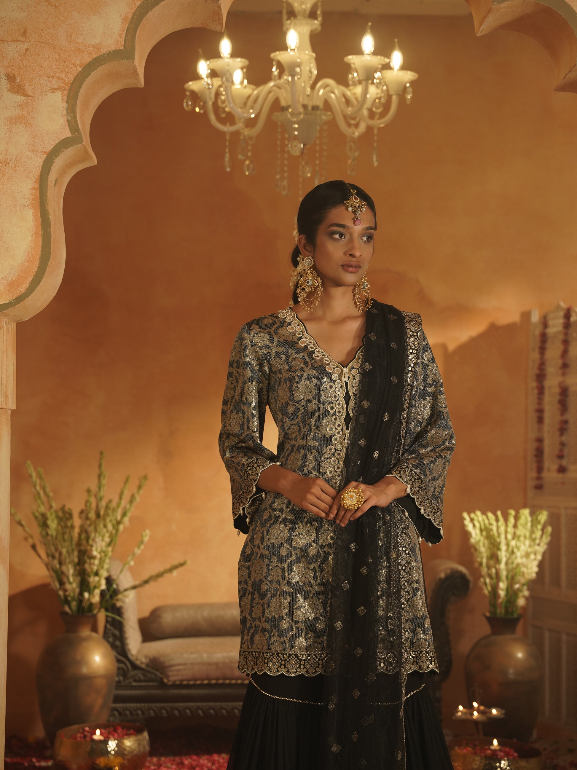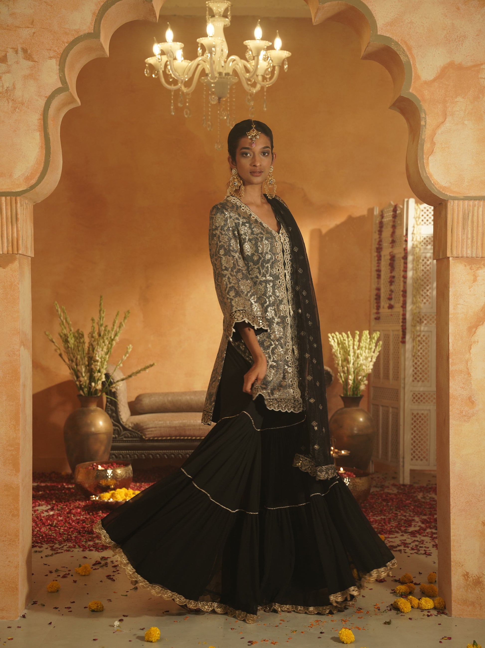 Mirrorwork scalloped front slit kurta, Layered Gharara and dupatta