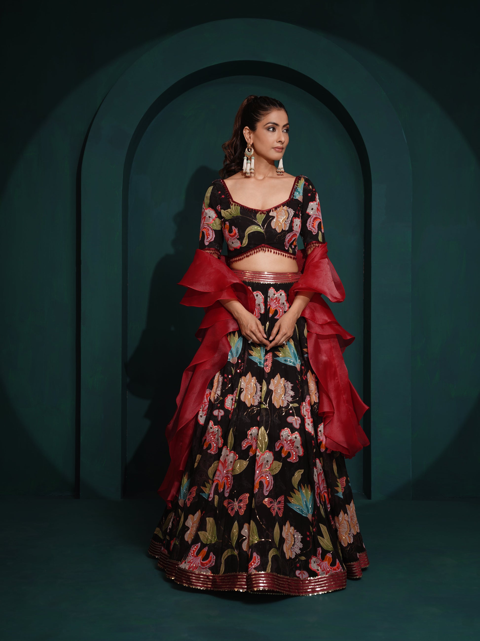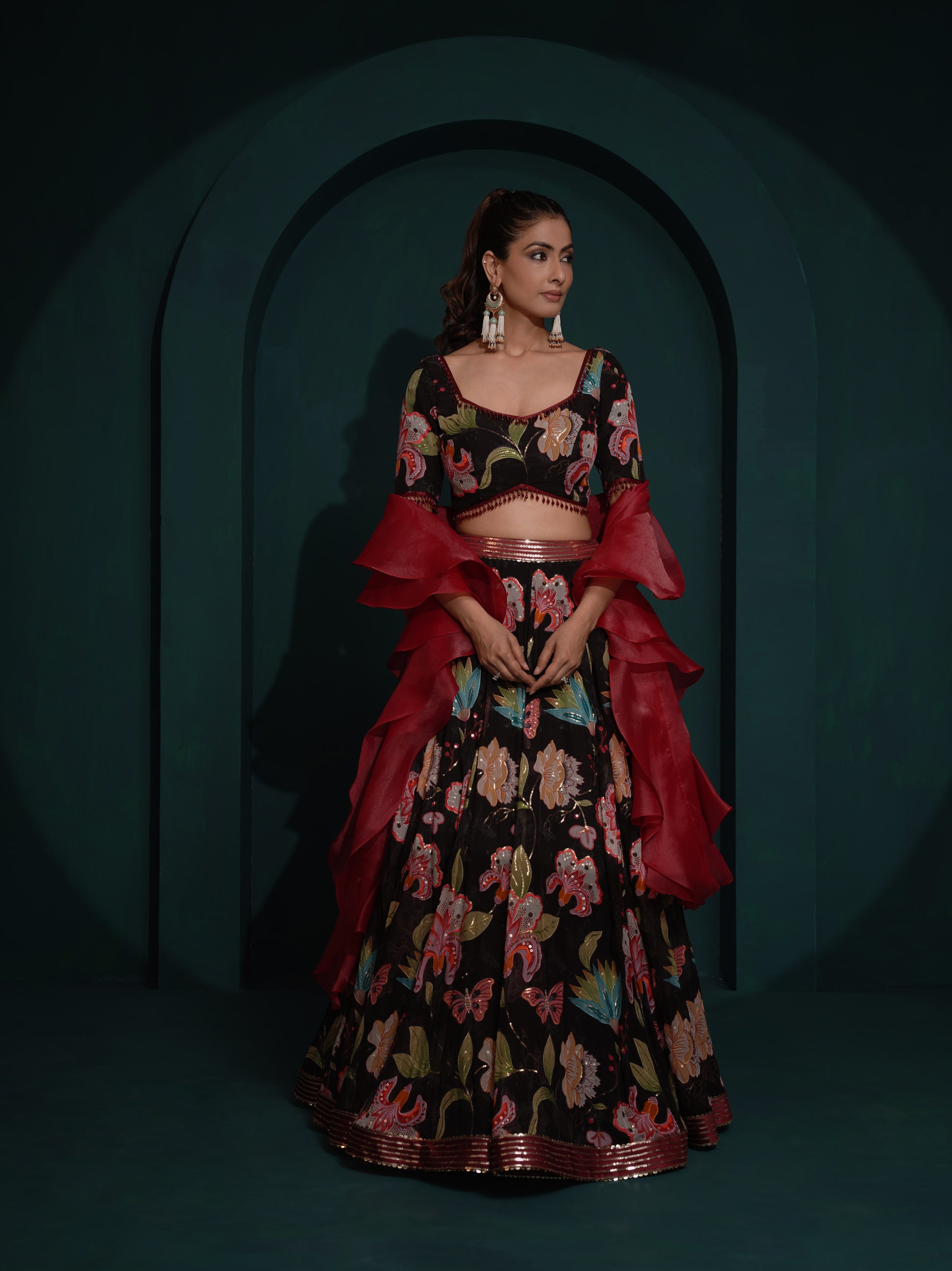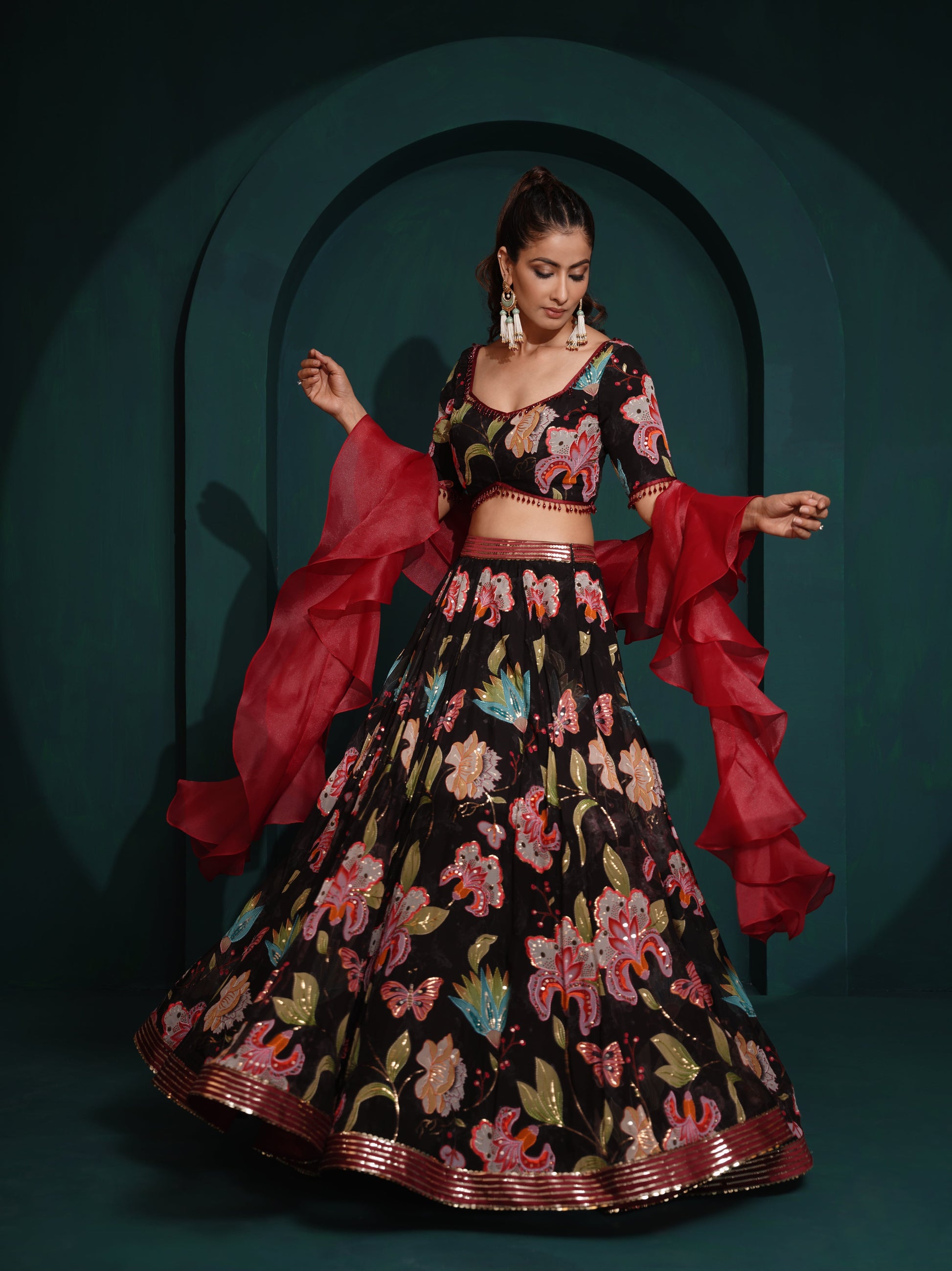 A black base lehenga featuring multicolored floral embroidery, crafted to perfection for a bold yet graceful look.