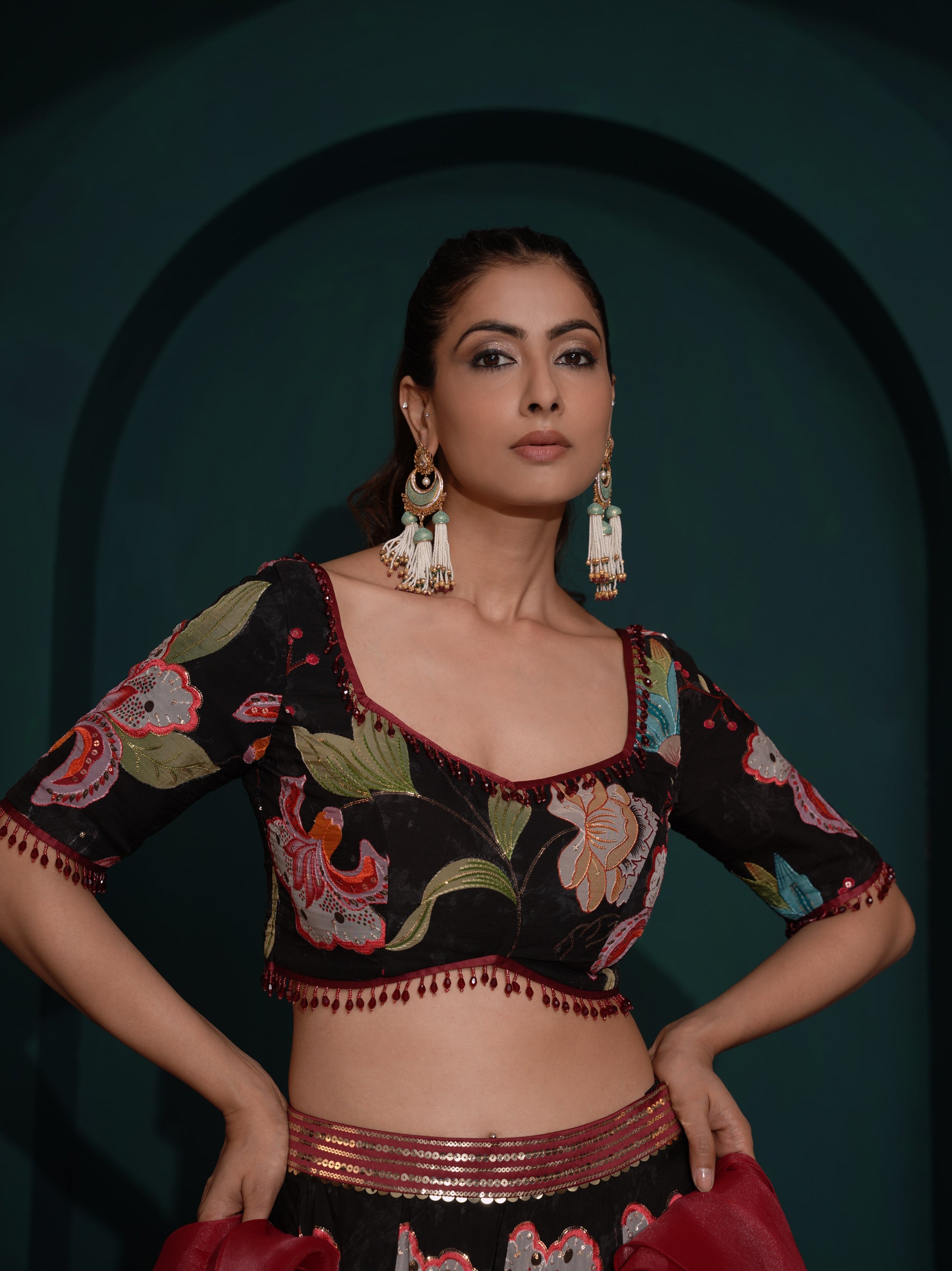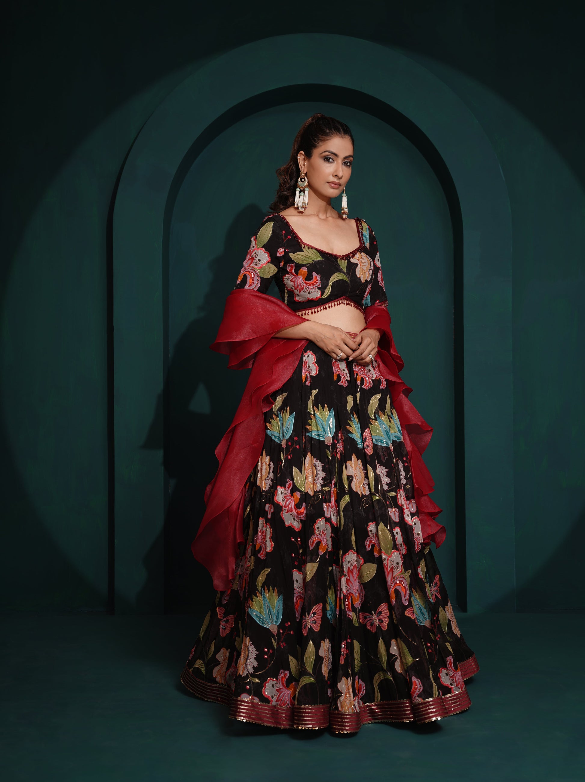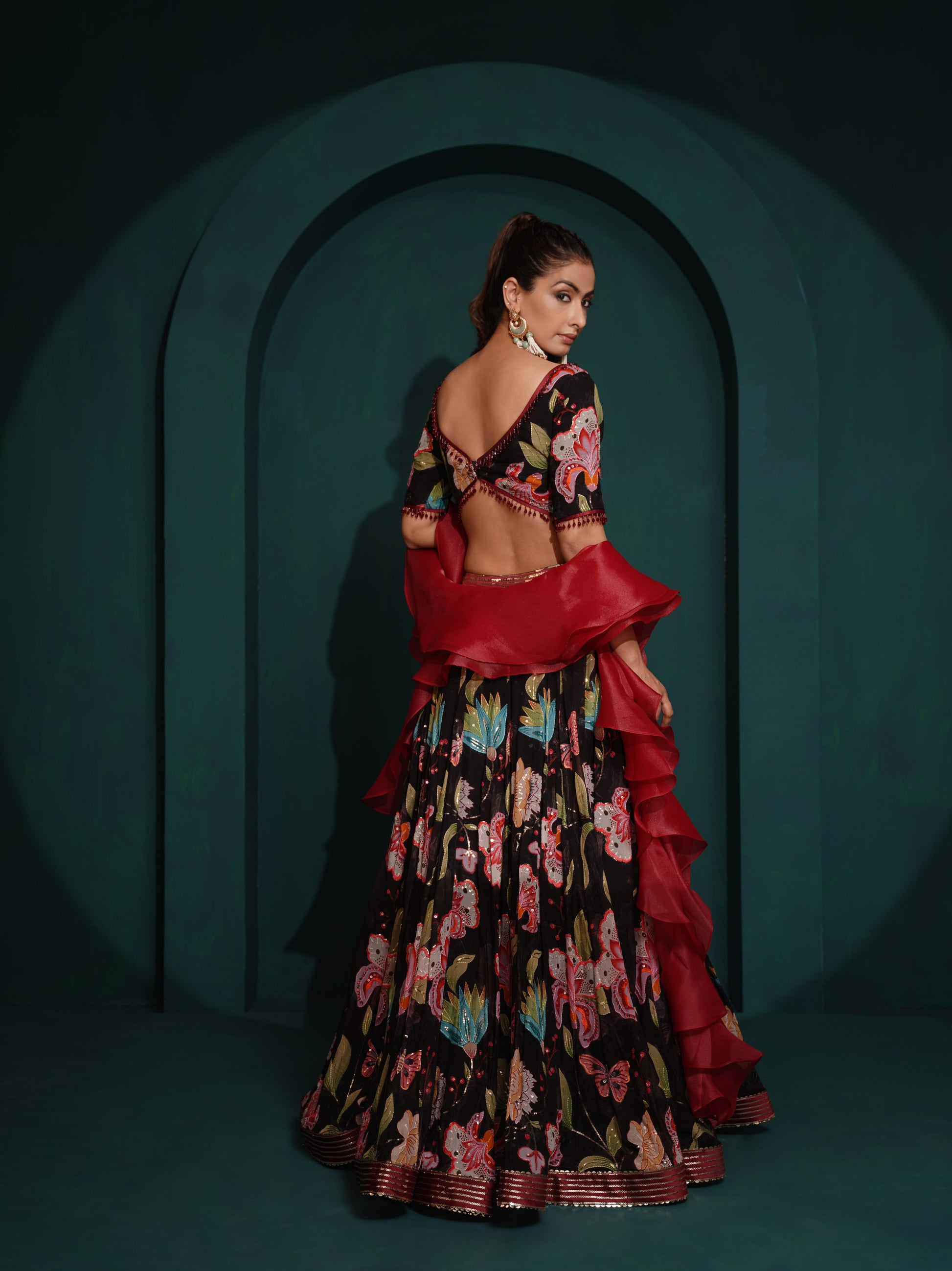 A black base lehenga featuring multicolored floral embroidery, crafted to perfection for a bold yet graceful look.